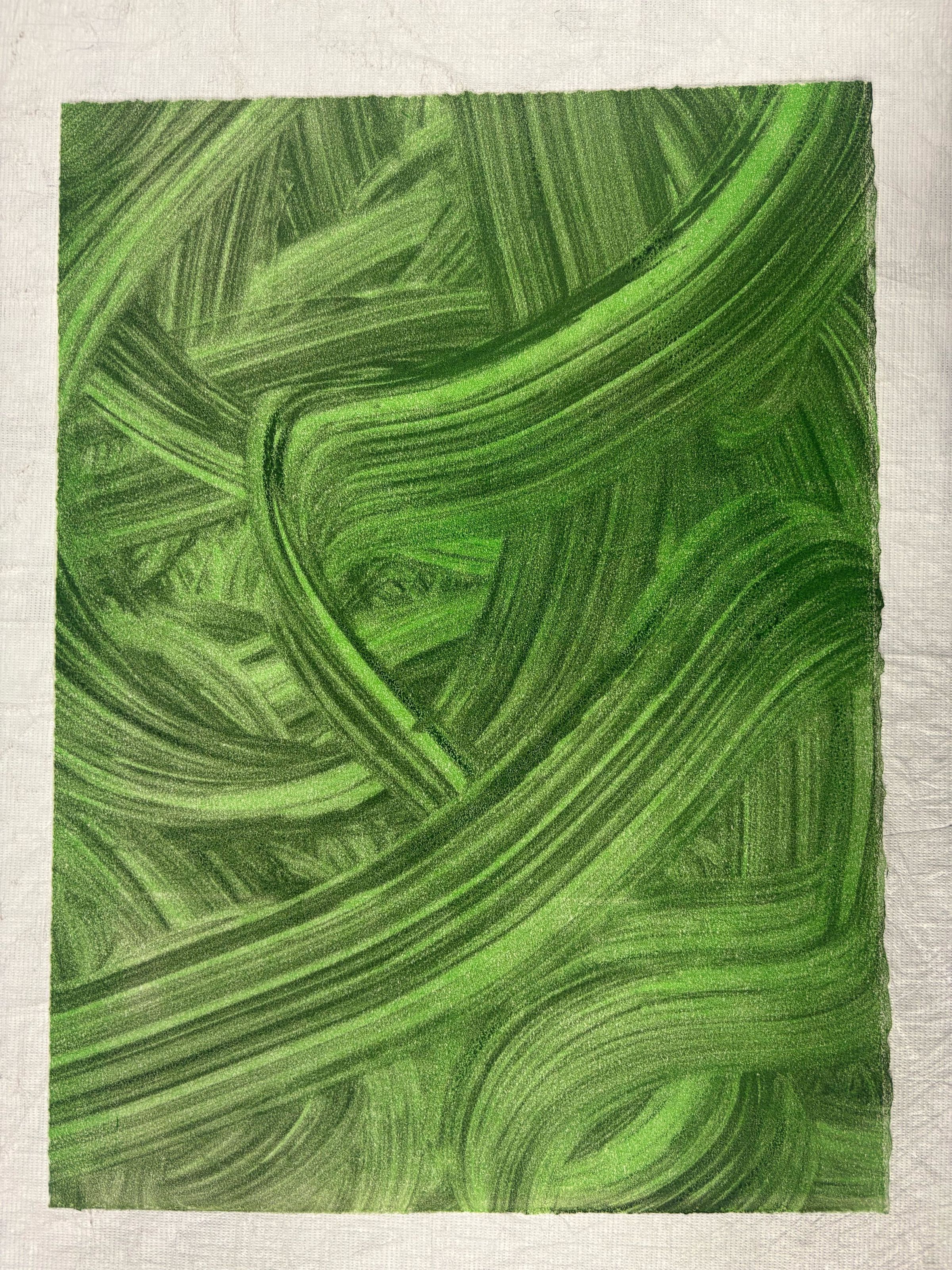 Medium, rectangular shaped print depicting green strokes of different shades of green brushworks layered and swirling in various directions.Collection