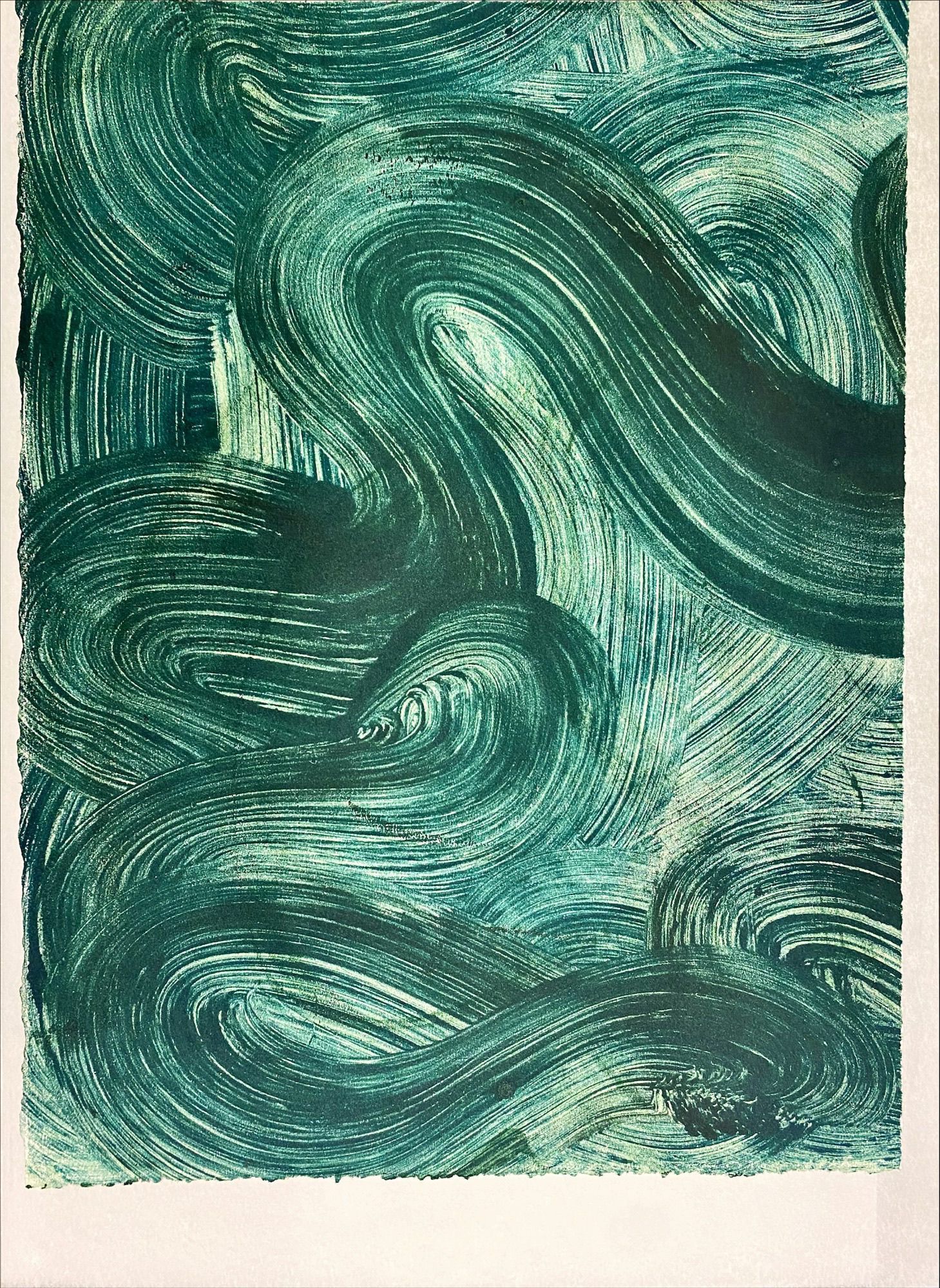 Medium vertically oriented abstract print with dark green pigments in a swirling pattern.Collection