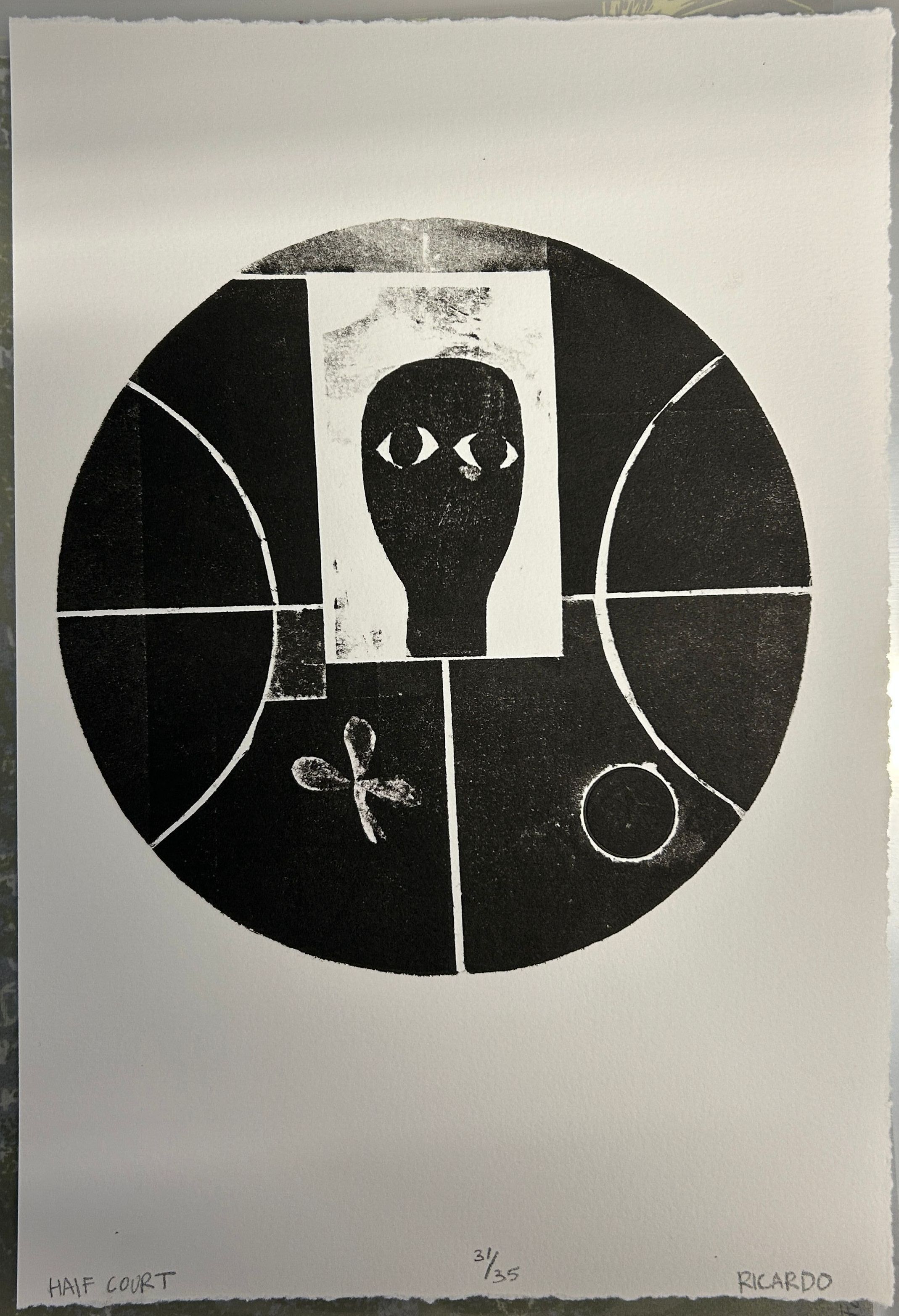 A small black and white print of a human figure over a court with organic and circular forms.Collection