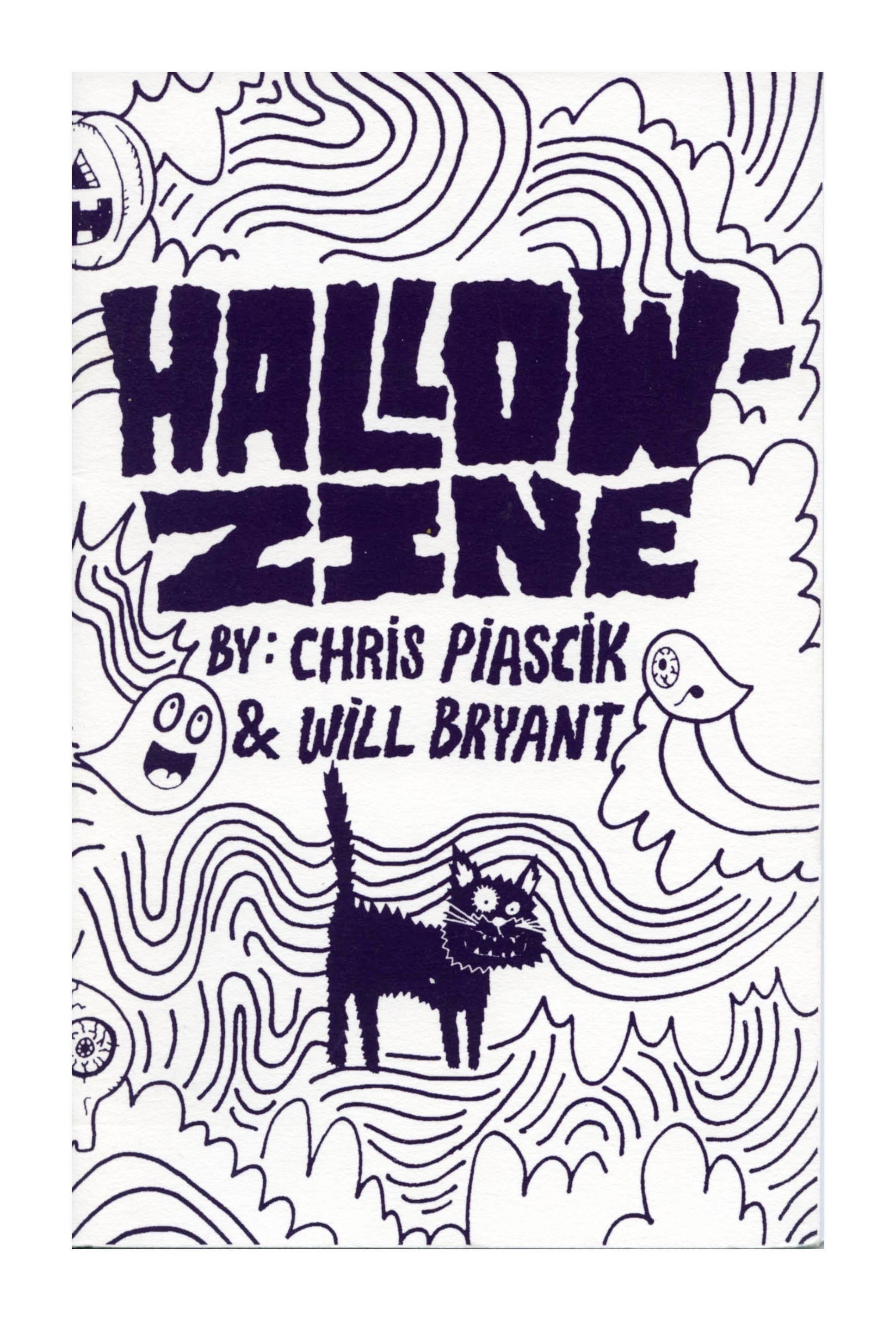 Blackish purple and white paper booklet with a halloween themed icons (ghosts, skeletons, pumpkins, vampires, black cat, etc.) decorating the front and back cover between a series of different line work. The Title and artist name are seen in the top center of the front cover above a black cat.Collection