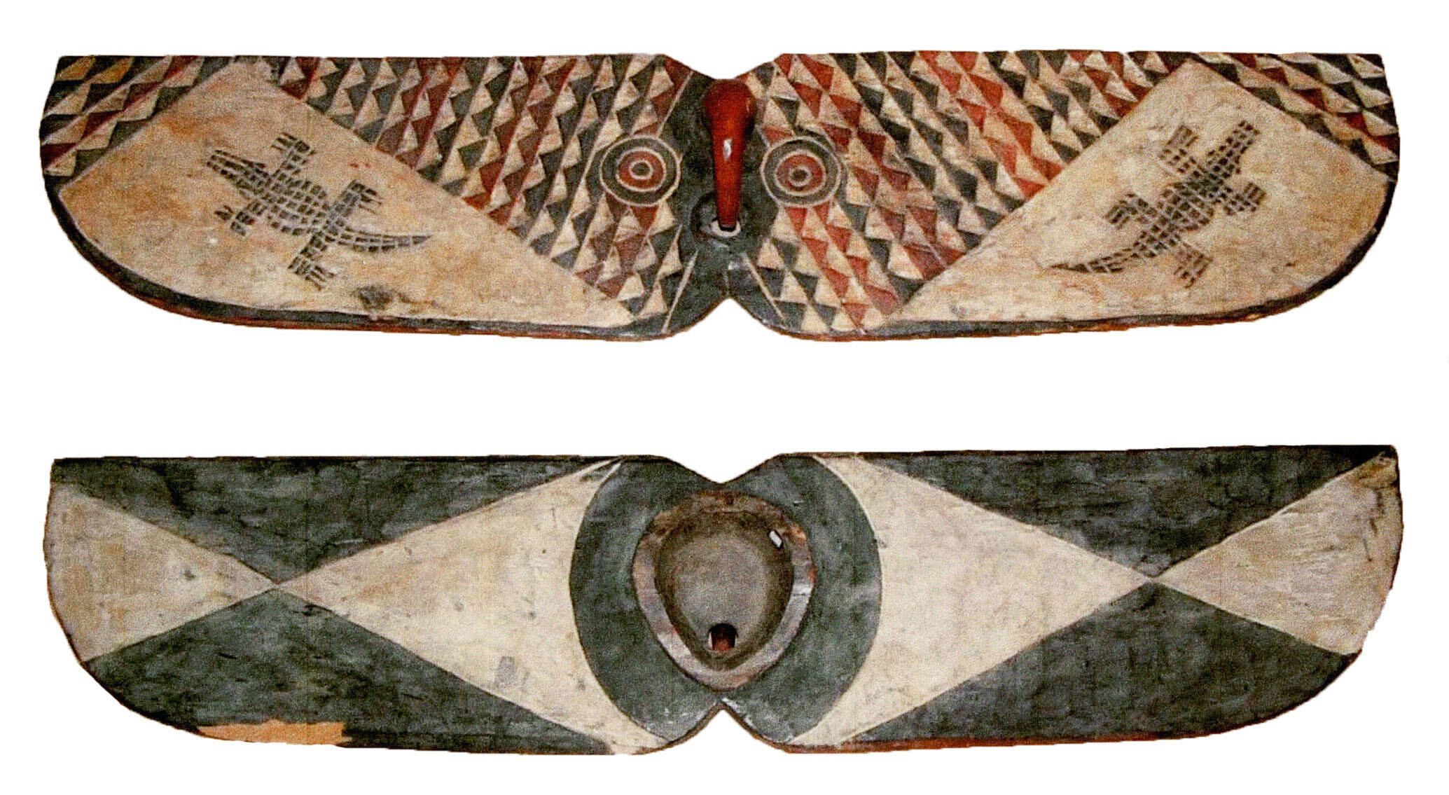 Carved and polychromed wood horizontal plank mask with crocodile motifCollection