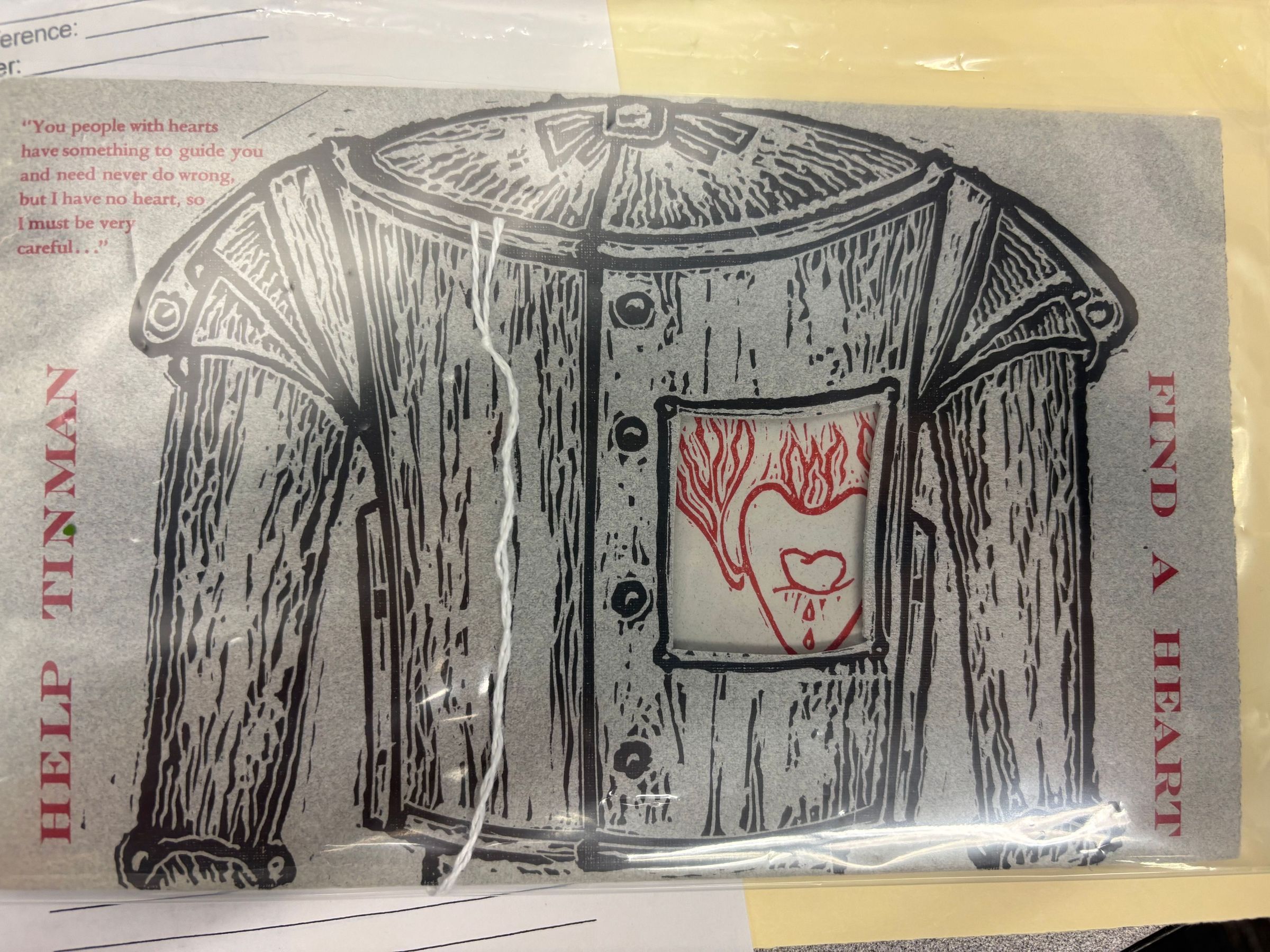 The zine's cover is foldable with a print on the front of a metal torso with a cutout showing a heart on the page beneath. The cut-out on the cover fastens on the back and a pocket contains a folded insert. It is written in a serif font.Collection