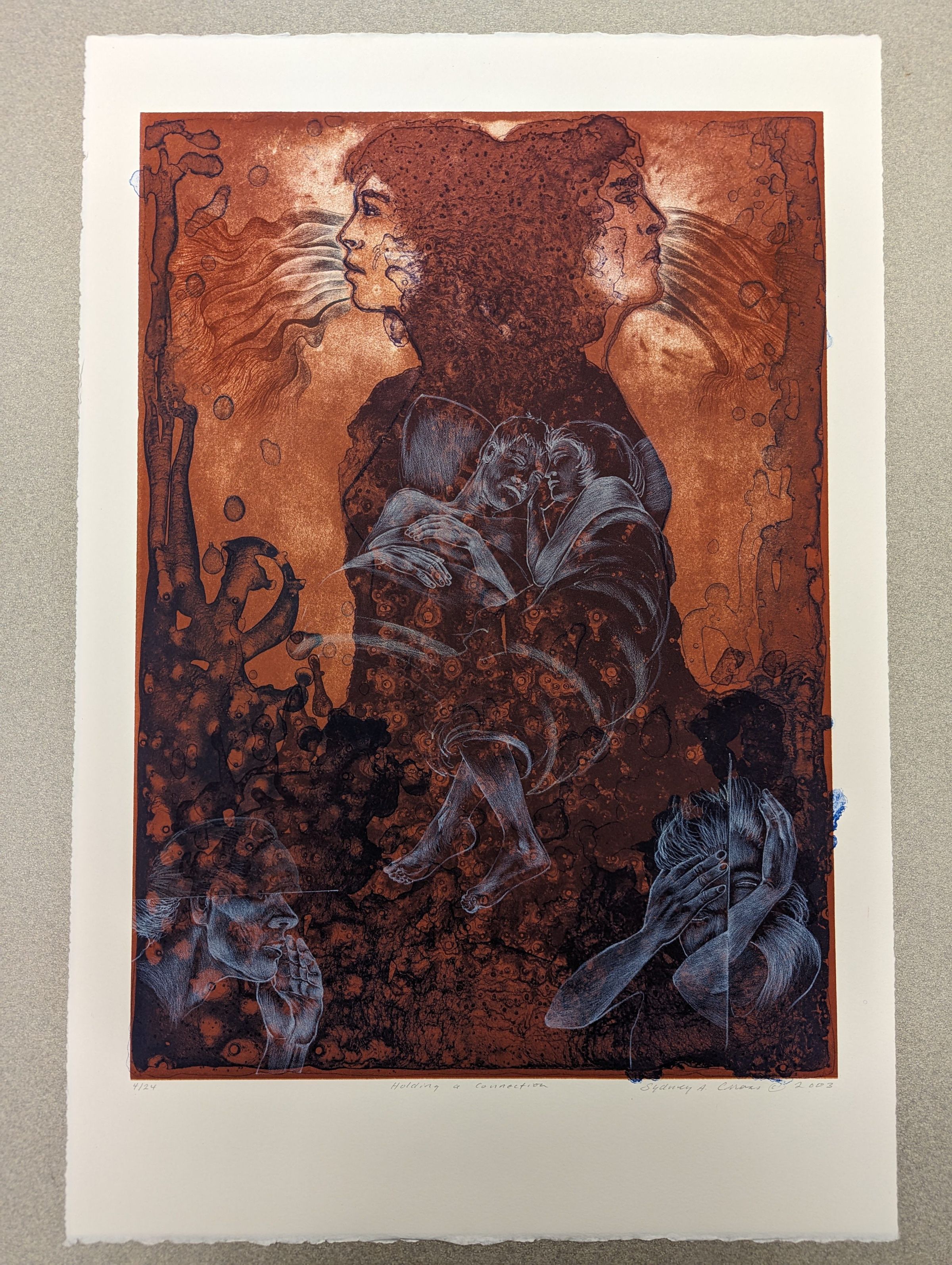 A large vertical print depicting a collage of scenes - a red-orange background filled with watery gradients, and two faces in profile looking in opposite directions and emitting waves, one smiling/wavy and the other frowning/arcing. Overlaid are hazy images of people in blue pigment.Context