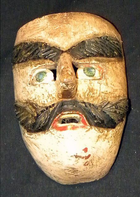 A life-sized rectangular wood mask depicting a man with an ivory complexion. Large, furrowed black eyebrows over cutout eyeholes for the wearer and green eyes. A straight nose Is above a large, black mustache and an open red mouth. A copper wire is attached to the back of the mask. Various signs of chipping and paint loss.Context