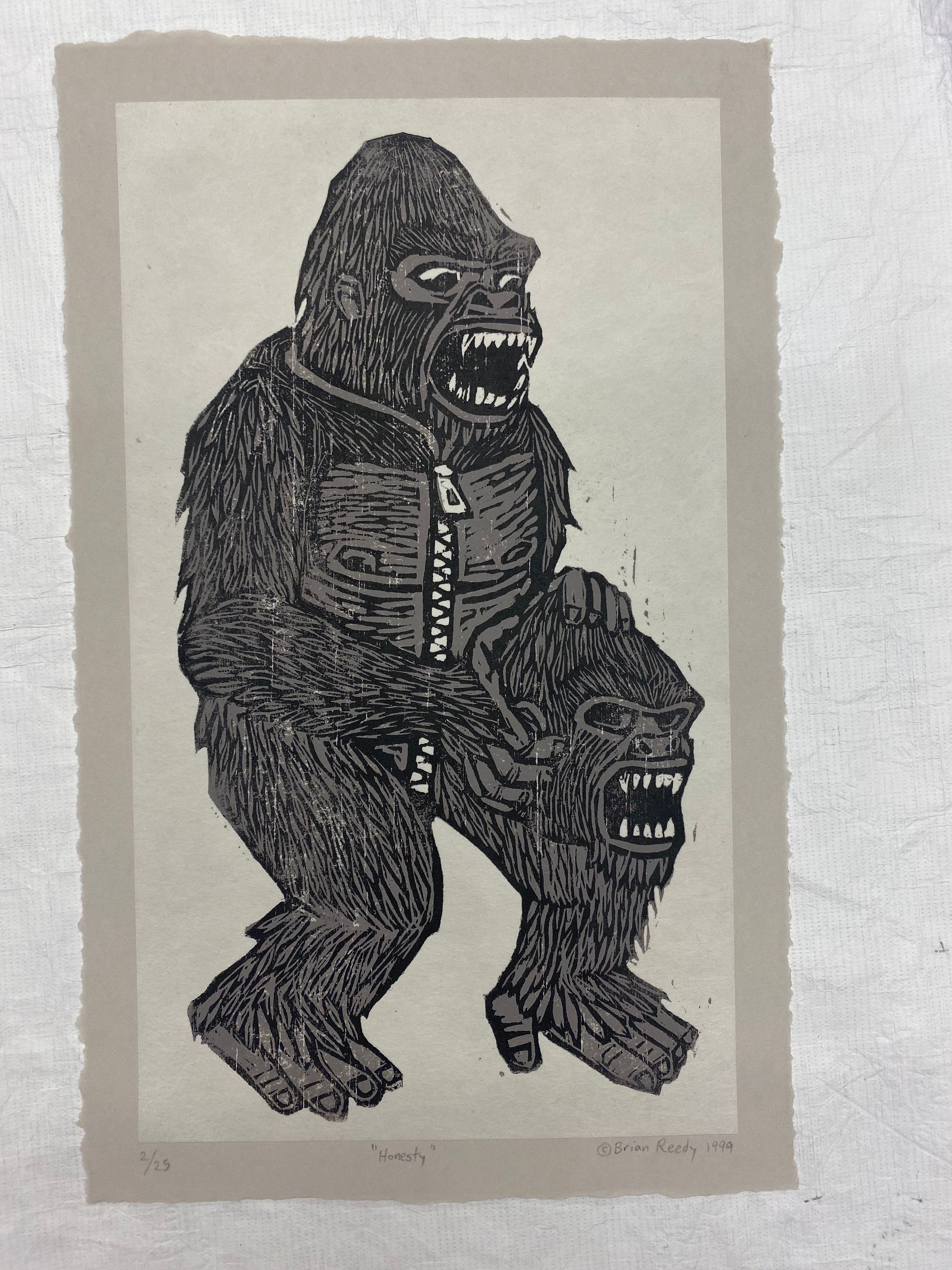 Small vertically oriented linocut print utilizing the chine collé process depicting a centrally placed gorilla in profile wearing a gorilla suit with a zipper and its teeth bared while holding a gorilla mask.Collection