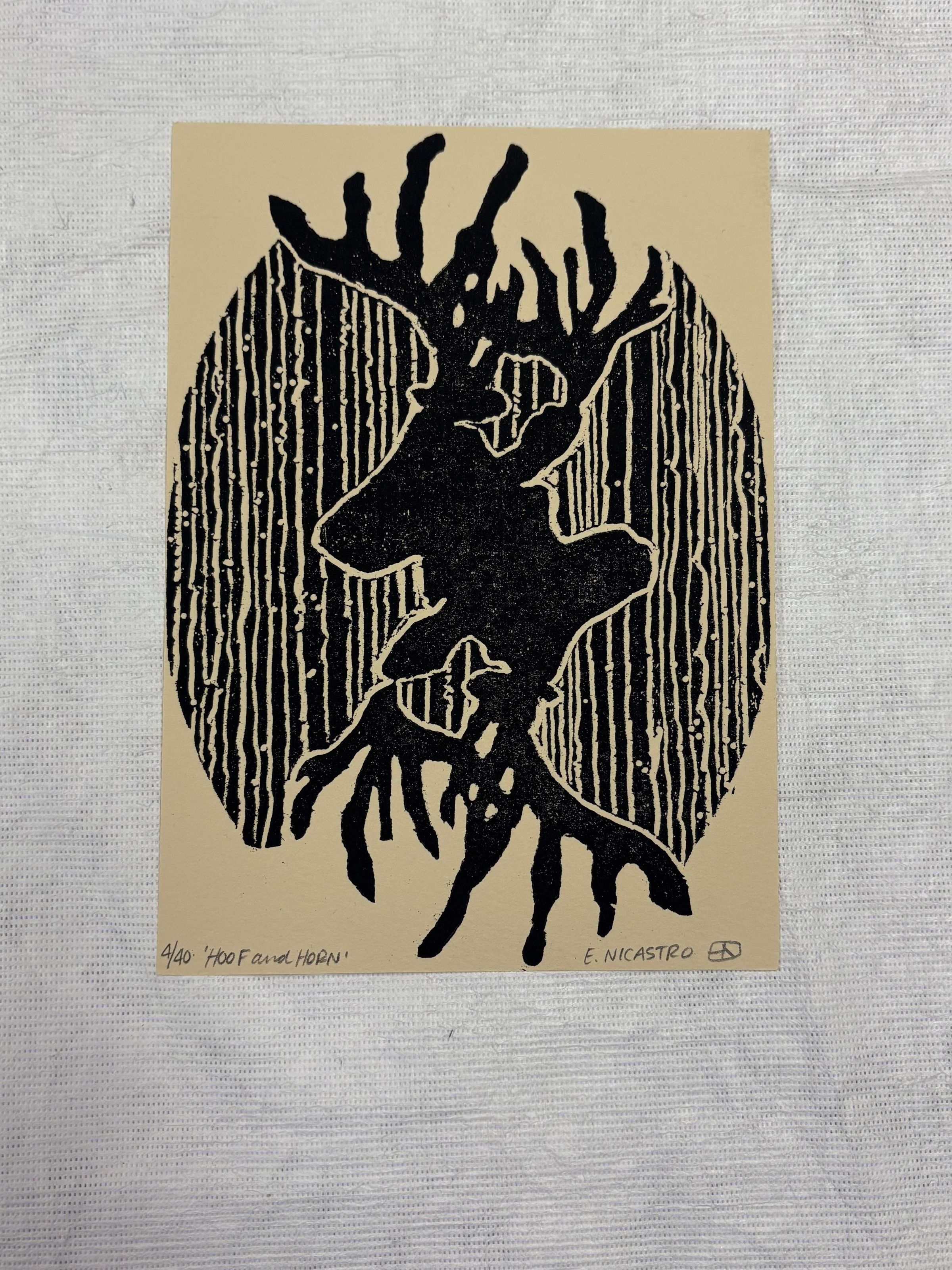 A small, vertically oriented print done on a cream colored ground with black pigment. At the center of the print in a sort of oval shape is the image of a horned deer-like animal's silhouette which has also been inversed vertically upon itself.Collection