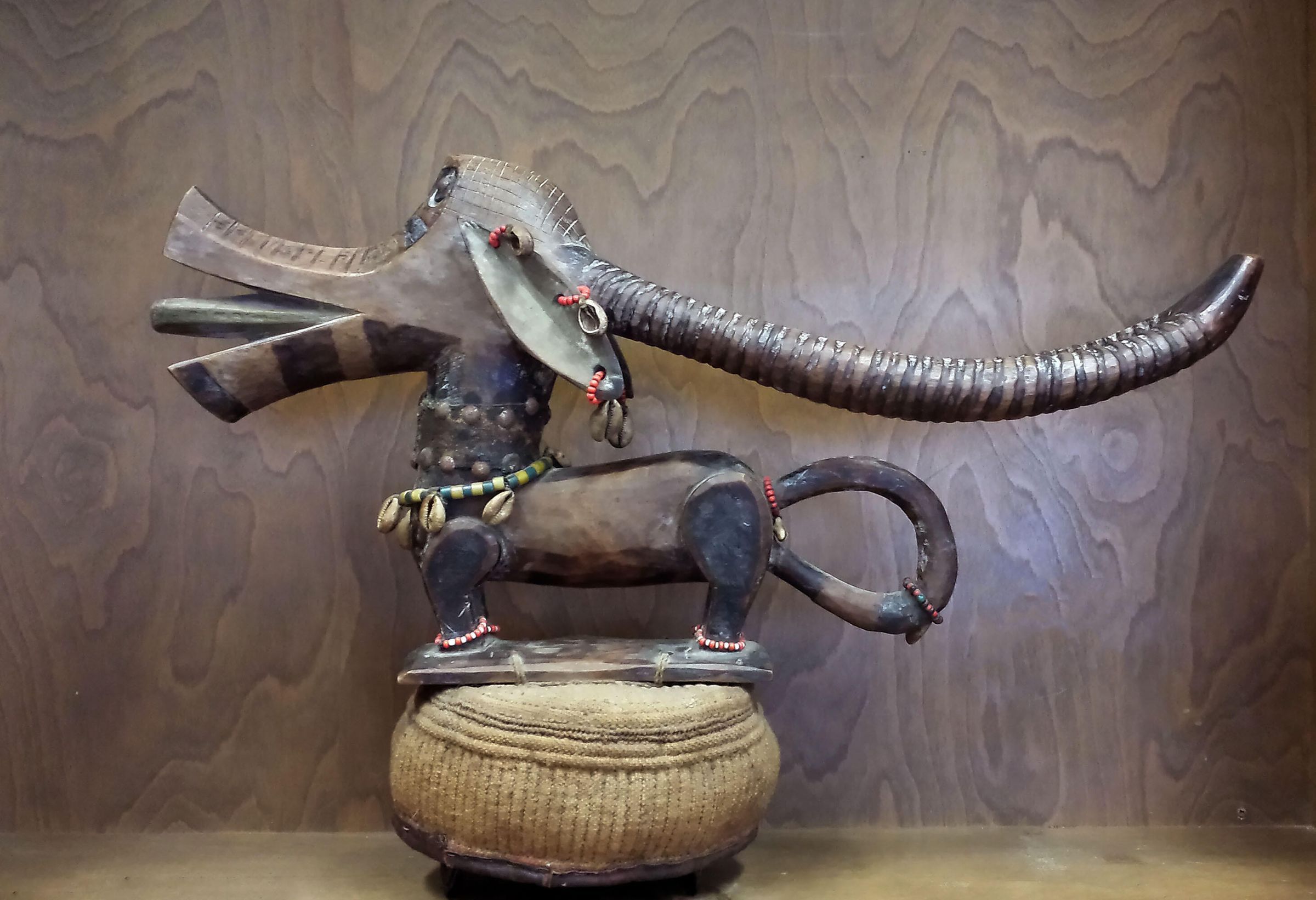 Medium wood sculpture of composite animal figure with horizontal horns, decorated with beads, tacks, and cowrie shells, mounted on fabric constructed head piece.Collection