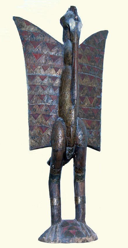 Large bird figure with outstretched geometric-designed wings, elongated bill, and applied metal platesCollection