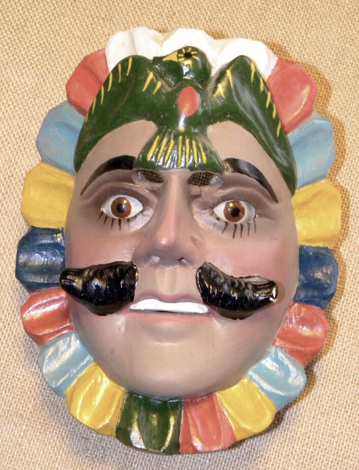 A long oval-shaped wood mask depicting a man with a light almond brown complexion and subtle blush accents on the cheeks and nose. A gold, red, blue, and light blue crown encircles the mask. A green bird with spread wings sits on the forehead. Inset brown glass eyes with lashes underneath and dark brown shading around. The cutout eyeholes for the wearer are under black eyebrows. The mouth is parted with blush-red lips and white teeth. A parted black mustache is under a straight nose. A copper wire is attached to the back of the mask. The mask is in excellent despite some paint chipping on the proper left mustache.Context