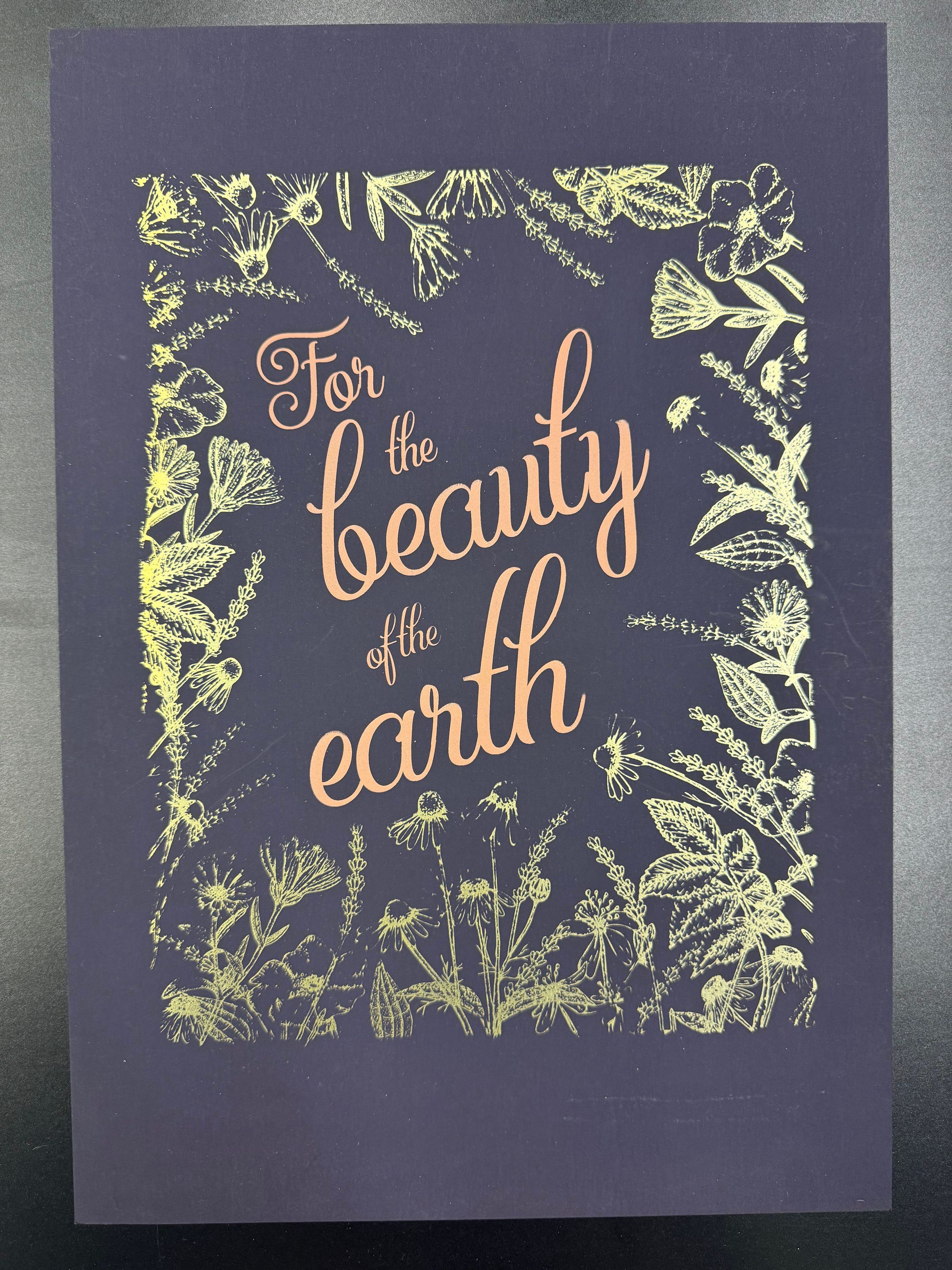 A large rectangular print with gilded metallic flowers and cursive text that reads "For the beauty of the earth."Collection