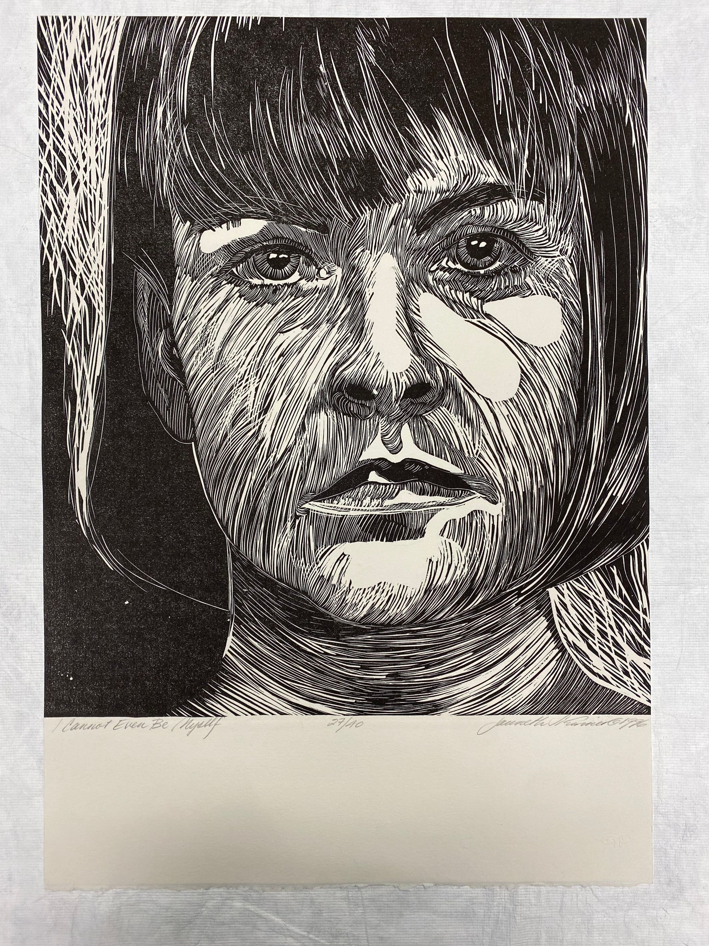 Large monochrome linocut print portrait of a female figure gazing at the audience. The figure is made up of repeated lines to create the face and textures of its hair. This print additionally utilized a pressure press process to integrate embossed text into the image.Collection