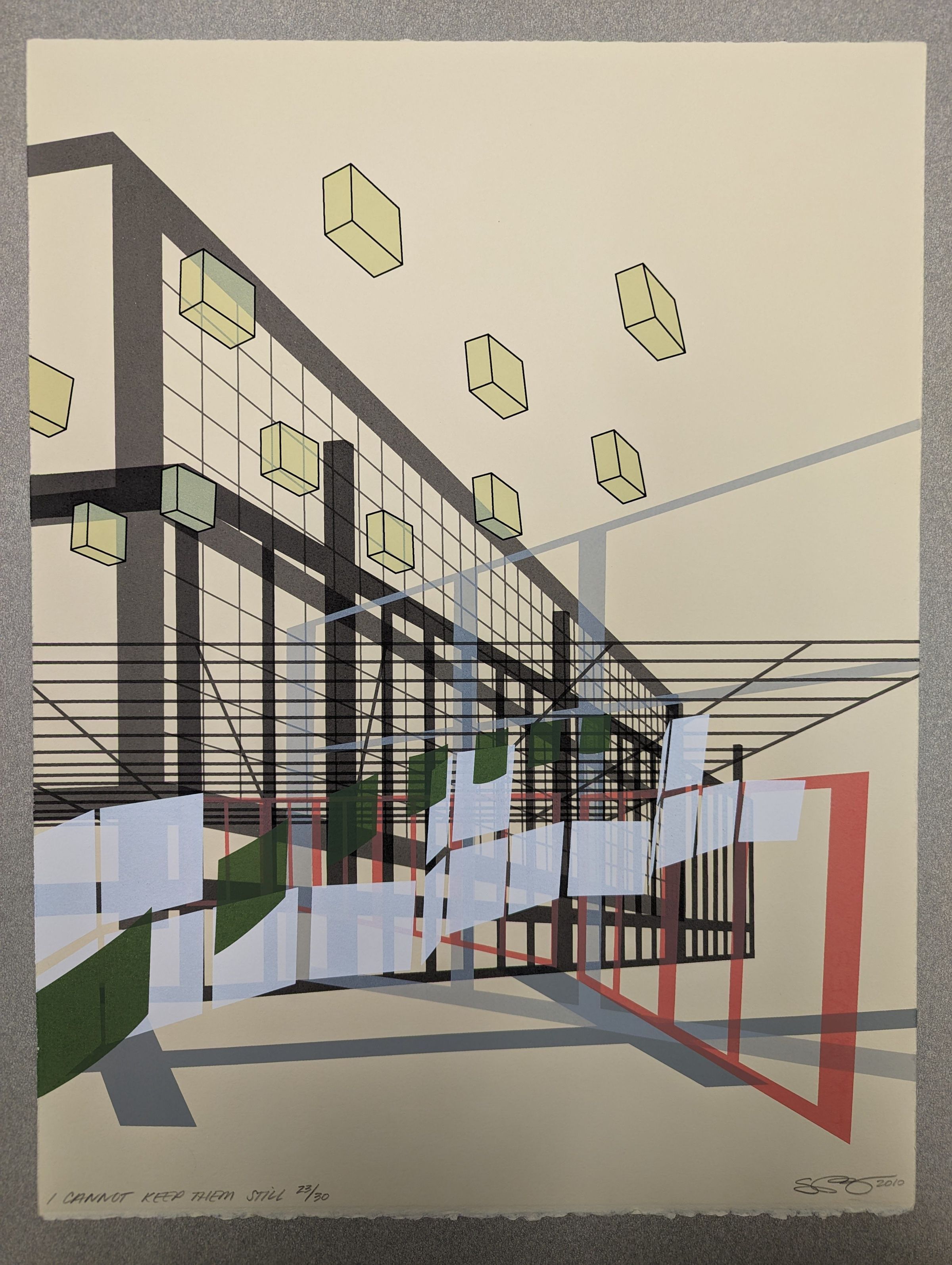 A vertical print showing a construction of abstracted grids and squares and cubes of different colors, resembling a cityscape but with elements floating in the air or running through each other over a blank background.Context
