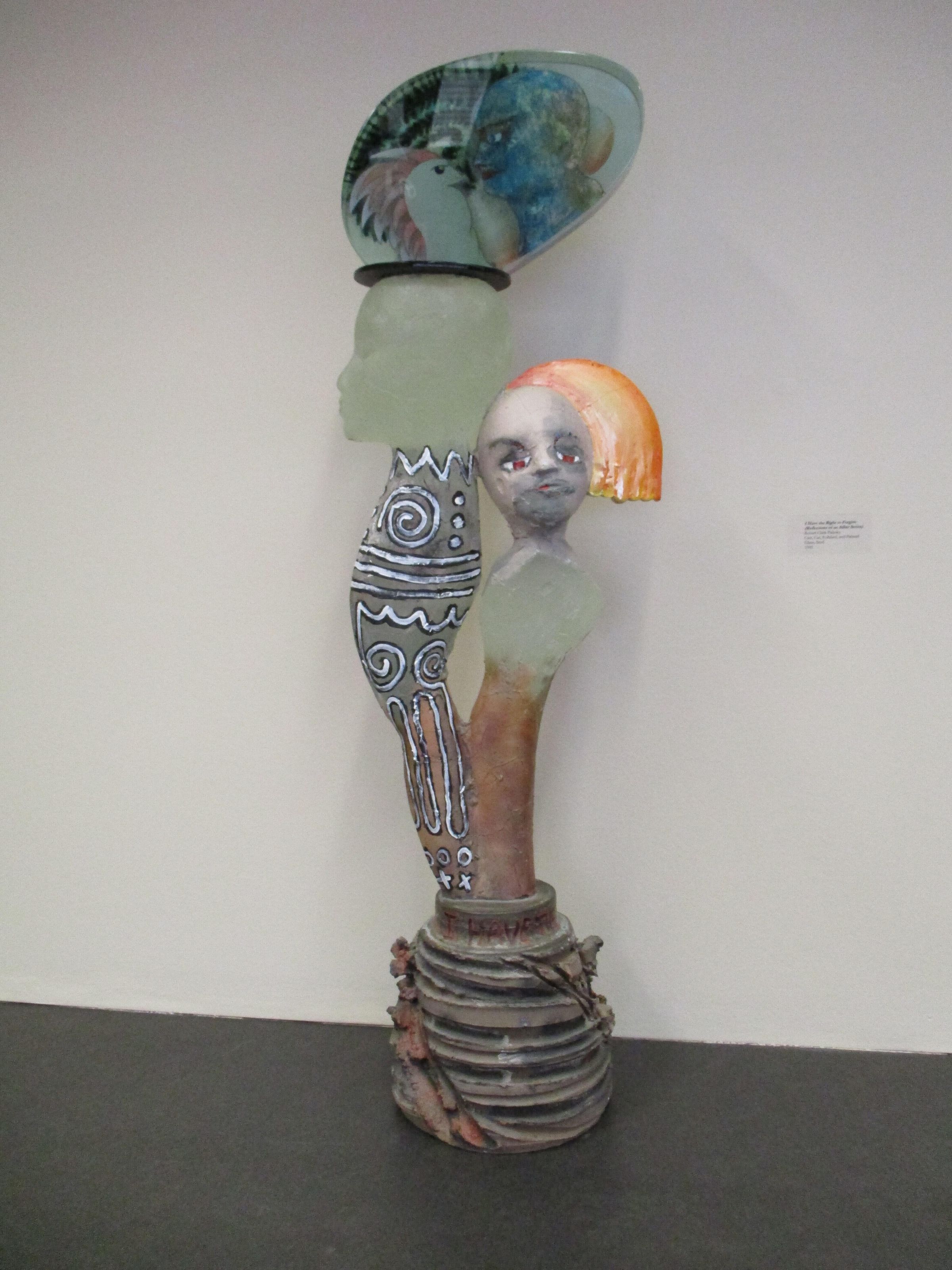 A cast and polished glass sculpture of two figures looking different directions: one with painted features and one without. Atop the head of the taller figure is a highly polished piece of glass with an image of a blue-skinned figure face-to-face with a bird. The "body" of the figure on the left is decorated with black and white designs.Collection