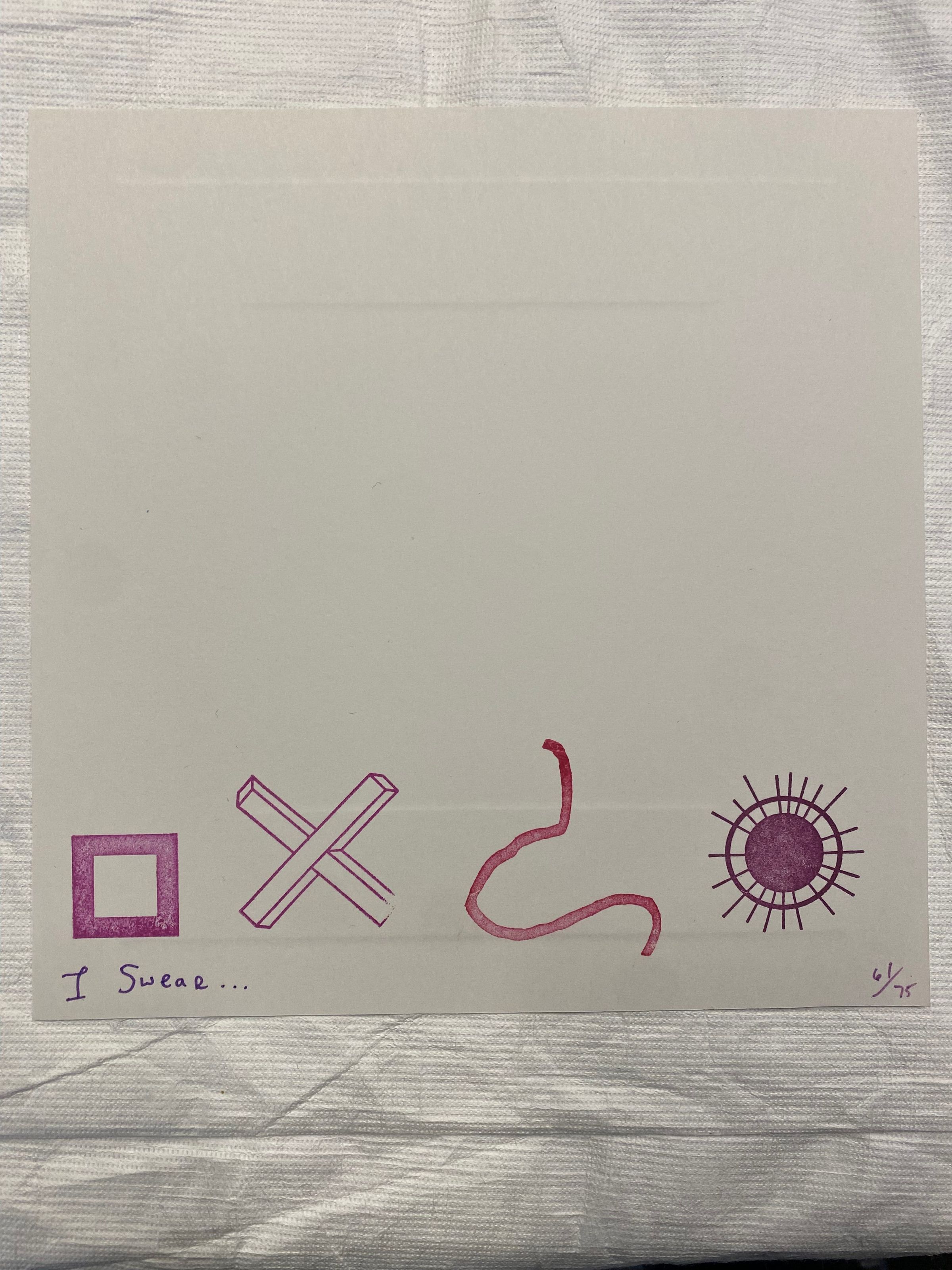 Small square print embossed with a central linear square with symbols printed across the bottom. The same square the image is embossed with, an x, one curved linear symbol, and a circle encircled with lines projecting from it.Collection