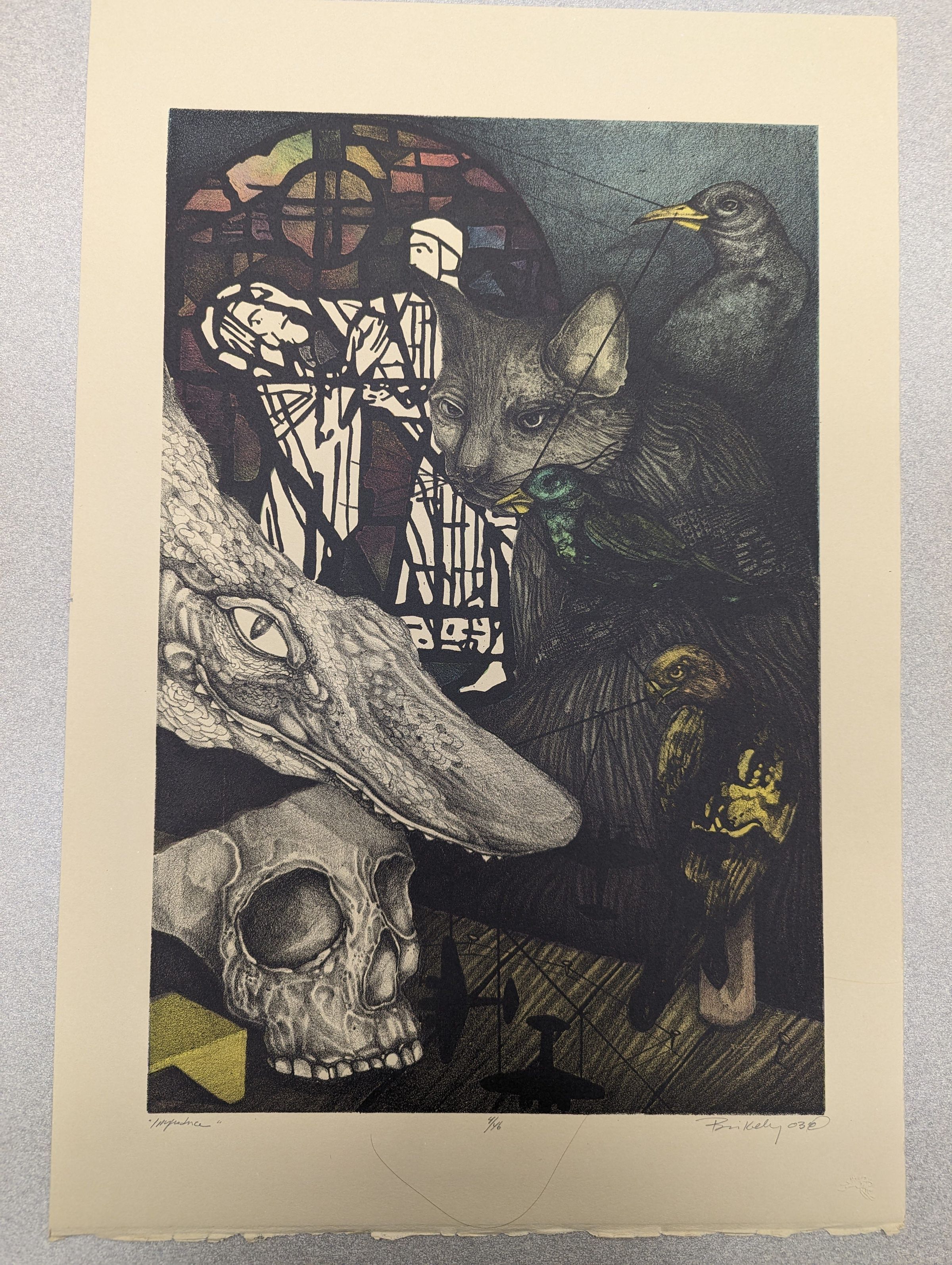 A scene of several animals and a skull accompanied by motifs of airplanes and church stained glass.Collection
