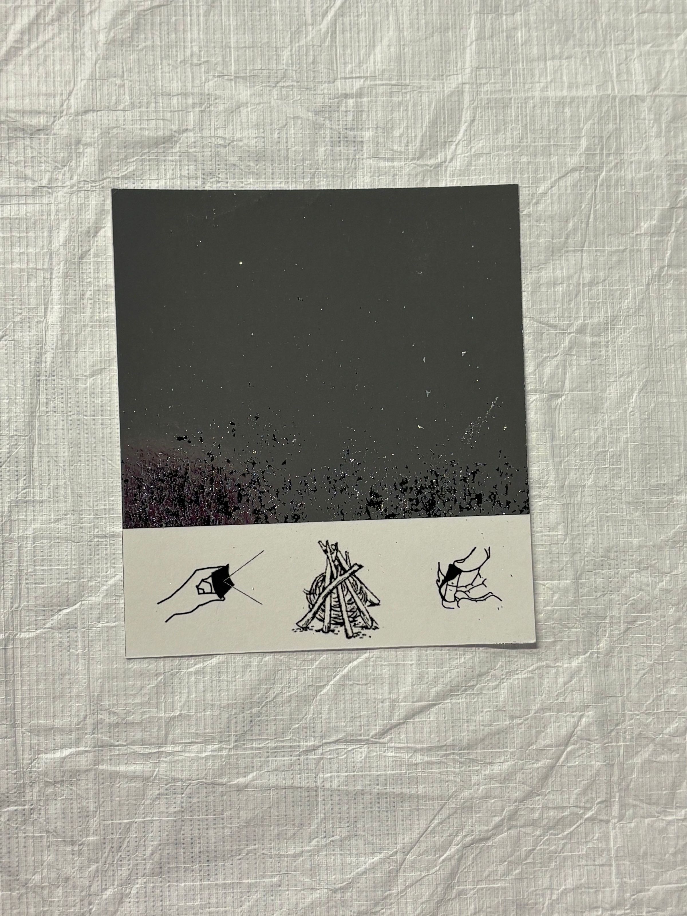 A small, vertically oriented print that has a large area of space dedicated to a metallic/reflective area. The print has a limited color scheme that consists of silver, white and black. The print has no text but, at the bottom of the print underneath the reflective area are images of a hands holding items and a campfire.