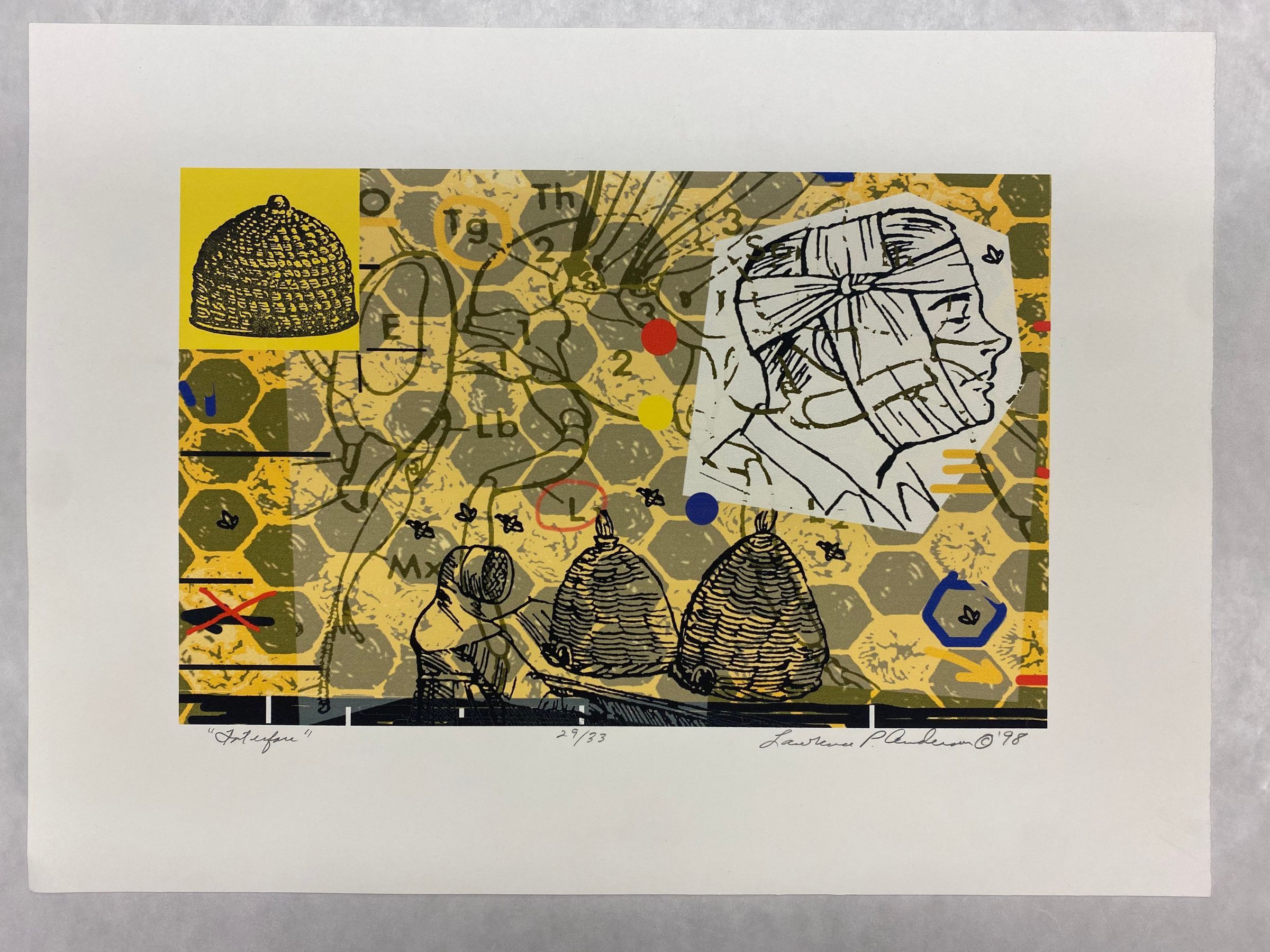 A medium sized, vertically oriented print that contains many connections to bees, beehives, and honey cones, with an underlying medical themes. The background of the print contains a hexagonal pattern which references honey cones and chemical formulas. Beehives occupy the upper left corner and lower right edge, while a human head that is bandaged up in profile view, facing right.Collection