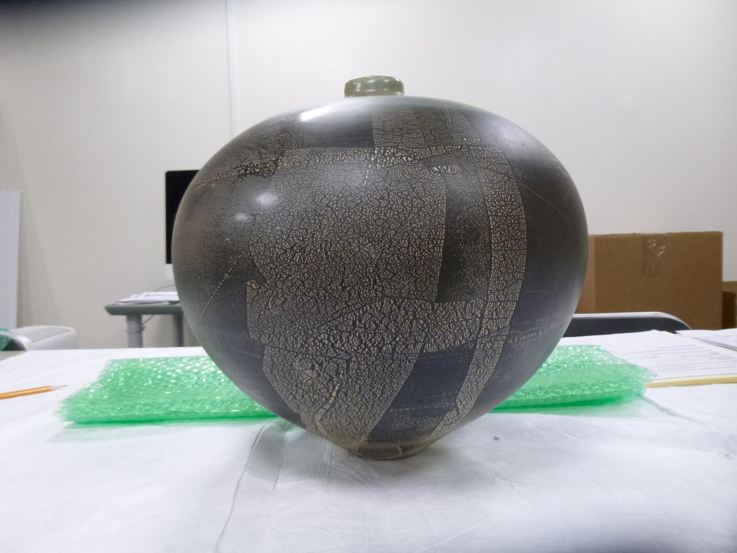 Blown glass vessel with small opening on the top. The vessel is primarily brown with some instances of blue and yellowish white, featuring a cracking pattern.Collection