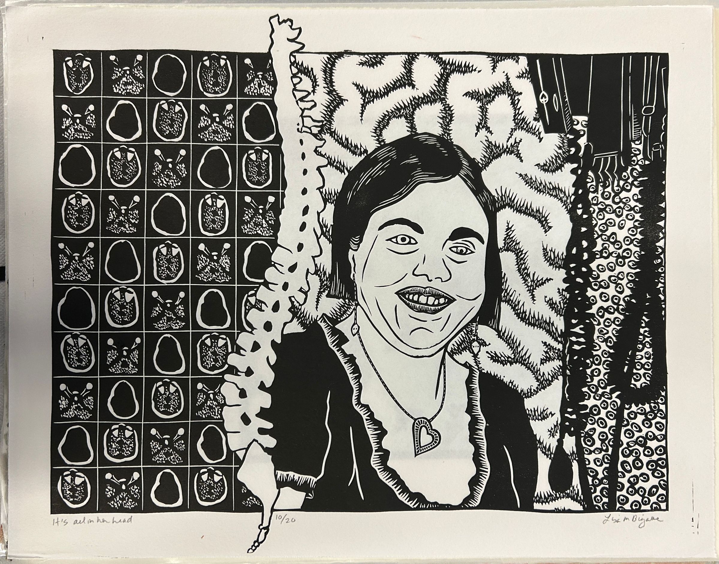 A large black and white print of a woman surrounded by various body parts, including a spine and brains.Collection