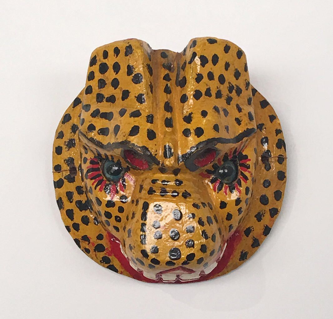 A large circular wood mask depicting a canary yellow jaguar with black spots. Two cutout eyeholes for the wearer above inset green eyes encircled by red and black painted eyelashes. There are square eyes and a furrowed brow. A wide nose is above an open red mouth showing two rows of large white teeth. A wire is attached to the back.Context
