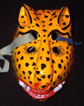 A large oval wood mask depicting a canary yellow jaguar with black spots. Two sets of round cutout eyeholes with painted black lashes. A long nose is above an open red mouth with white teeth. Grey and blue ribbons are tied around the mask through the top set of eyeholes. A wire is attached to the back.Context