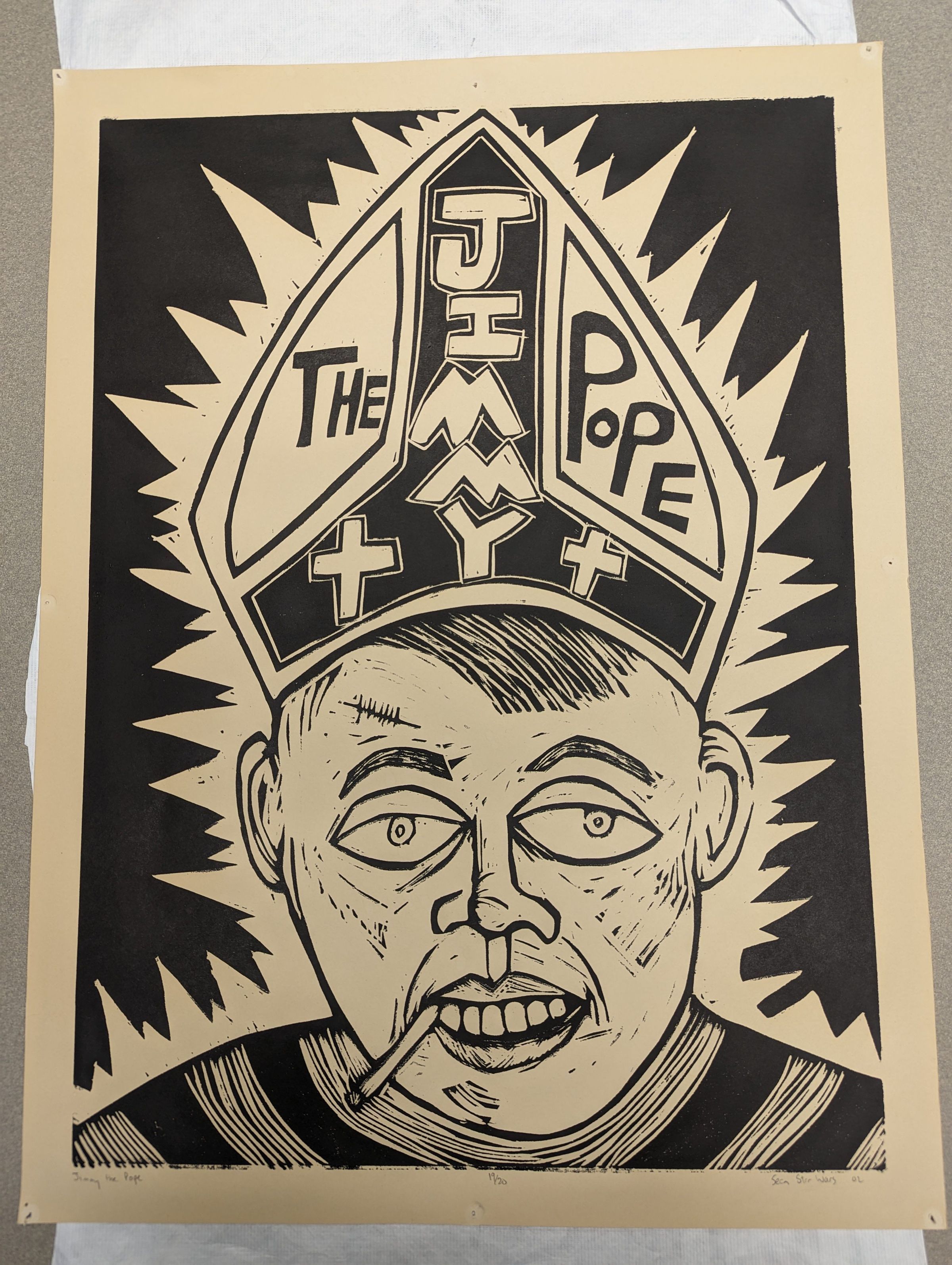 A large black print on cotton rag paper depicting a cartoon of a boy with a hat titling him "Jimmy the Pope", surrounded by a spiky halo. The boy is smoking a cigarette and has a stitched scar over his right eyebrow.Context