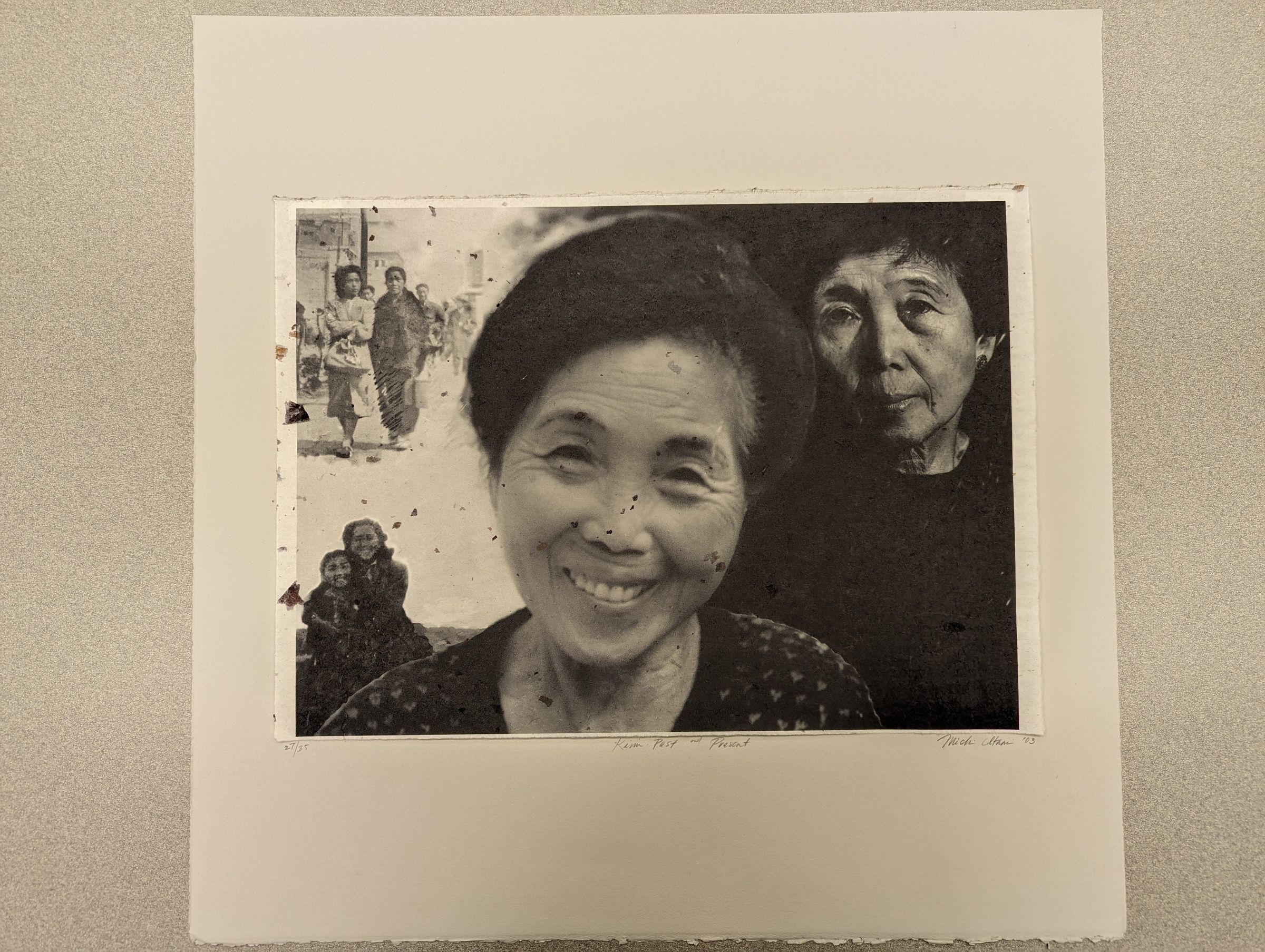 A photographic collage print with a woman's smiling portrait centered in the middle; to the right, her face is visible against a black background, much older, and to the left there is a scene of girls sitting or walking down a busy city street.Context