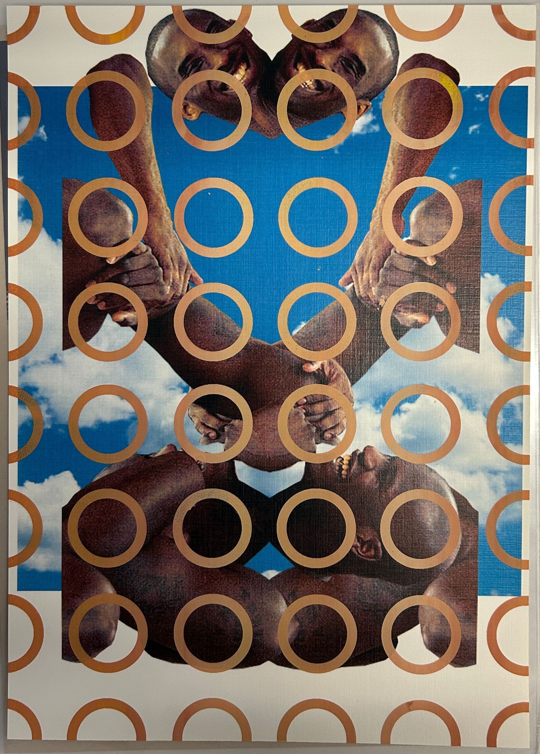 A small and colorful print of a male figure, mirrored with circular forms overtop and clouds in the background.Collection