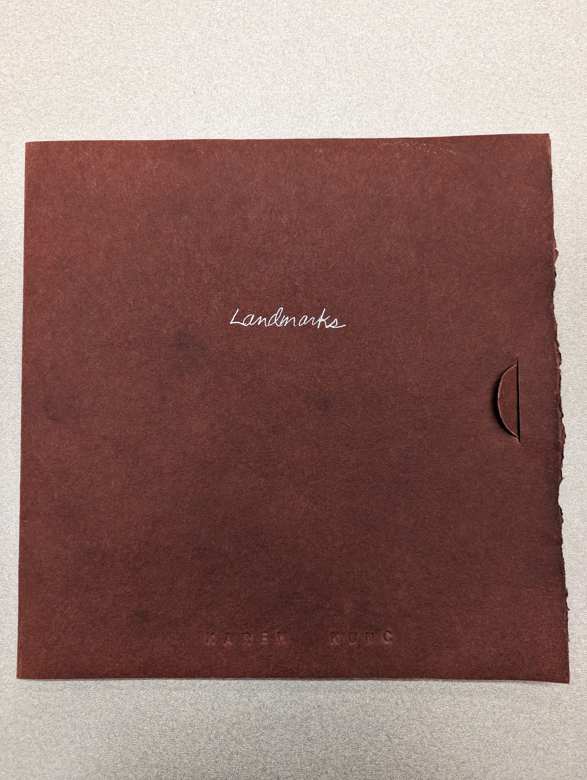 A red square cardboard box/folder titled "Landmarks" in white ink in the top middle, with "Karen Kunc" embossed in the bottom middle. Inside it is a series of prints layered with mullberry paper.Context