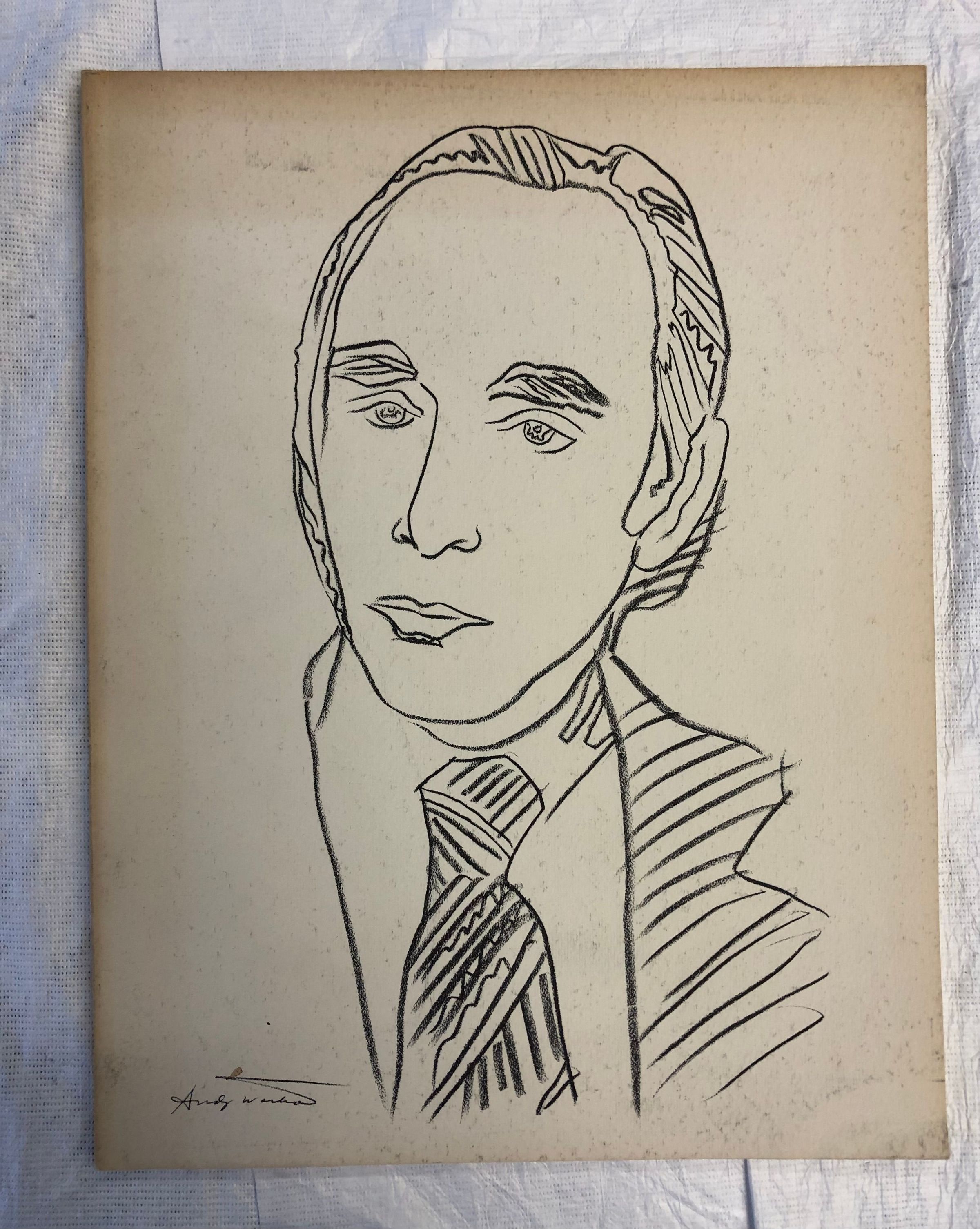 A medium-large, thin, white book with a sketch portrait by Andy Warhol mirrored on the front and back cover. The interior is a catalogue of works by various artists dedicated to Leo Castelli, with images in black and white.Collection