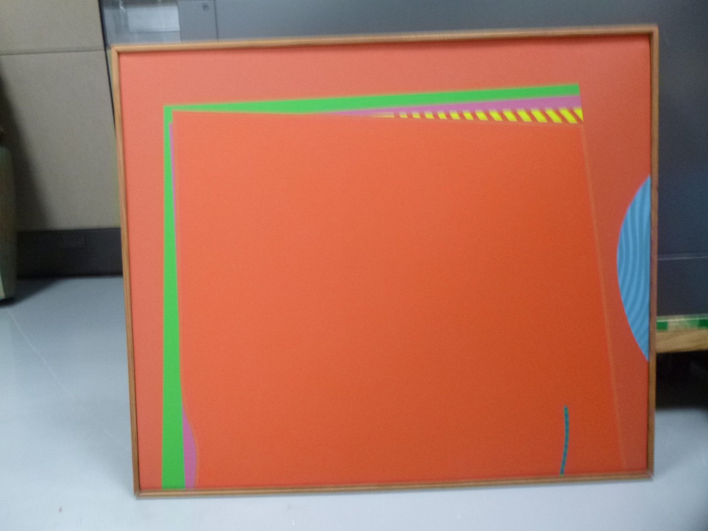 Large horizontally-oriented colorful painting of abstract shapes in orange, green, blue, yellow, and red pigment.Collection
