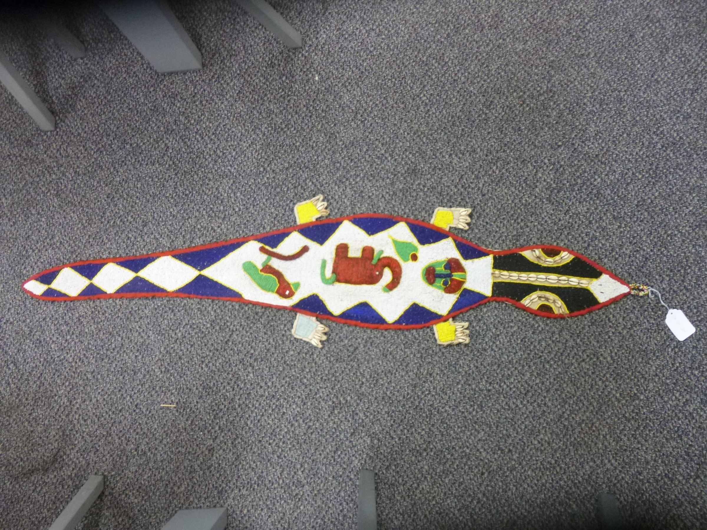 A large lizard-shaped, beaded textile with seashell claws. On the lizard's back are a human face, an elephant, and bird in red and green. The lizard's face is adorned in shells and its back and tail are backgrounded by a white and blue diamond pattern.Collection
