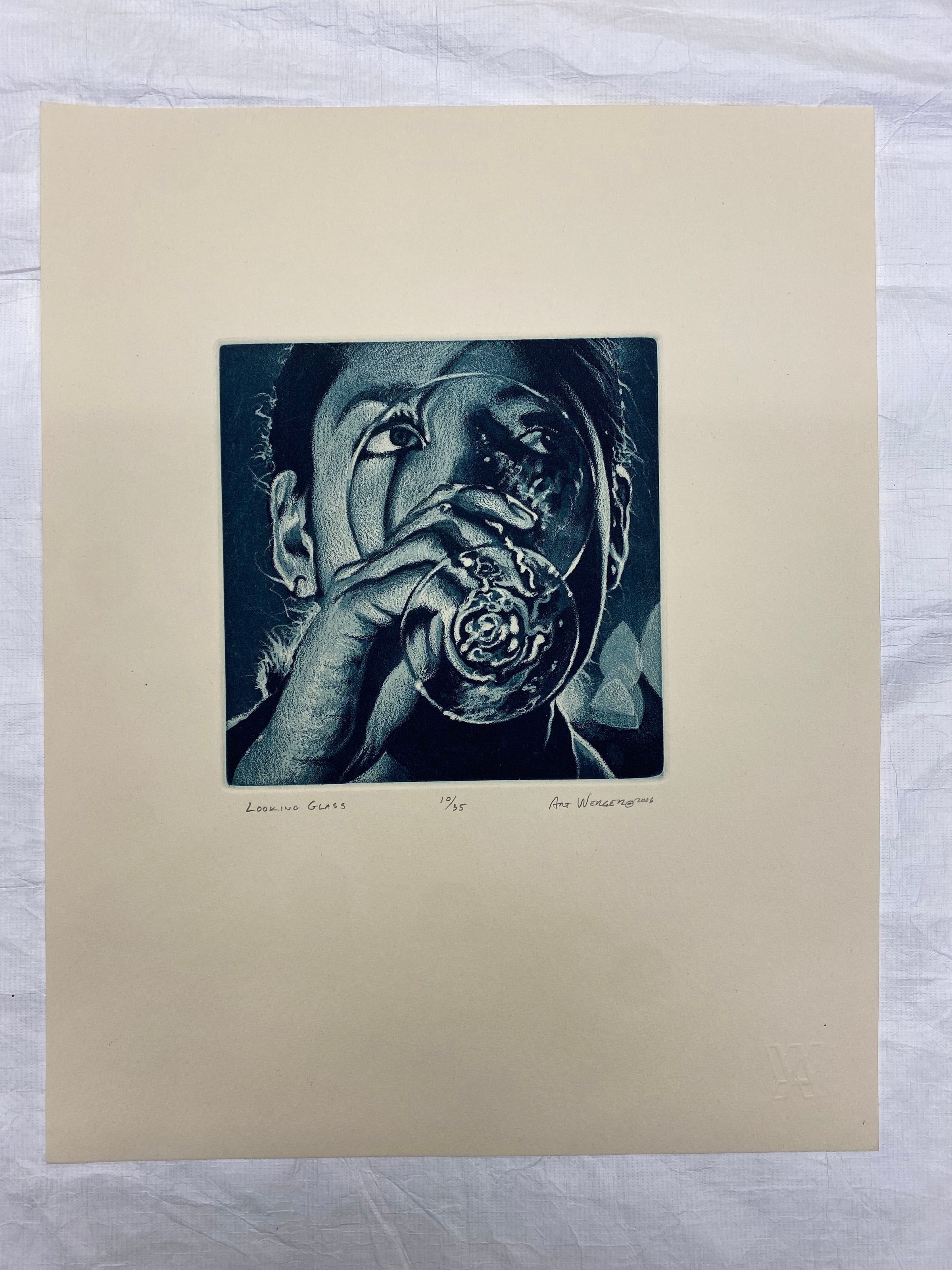 Medium-sized Mezzotint monochrome print on embossed cotton rag paper with straight-cut edges. Image is a centrally placed female figure drinking from a cocktail glass emphasizing the contrast of lighting and curved lines.Collection