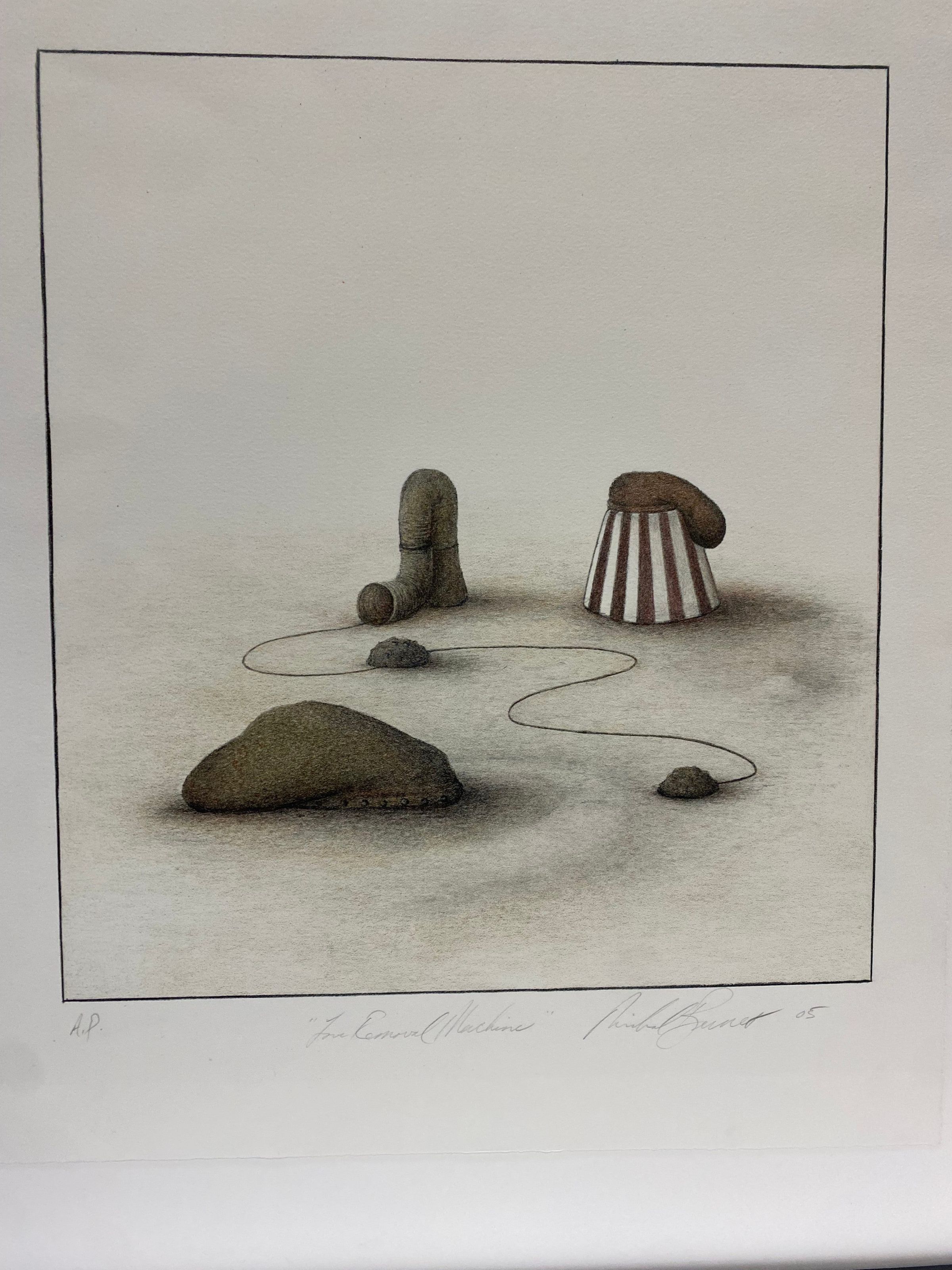 Medium vertical lithographic print of abstract amorphic figures utilizing black, brown, red, and white tones centered on cotton rag paper.Collection