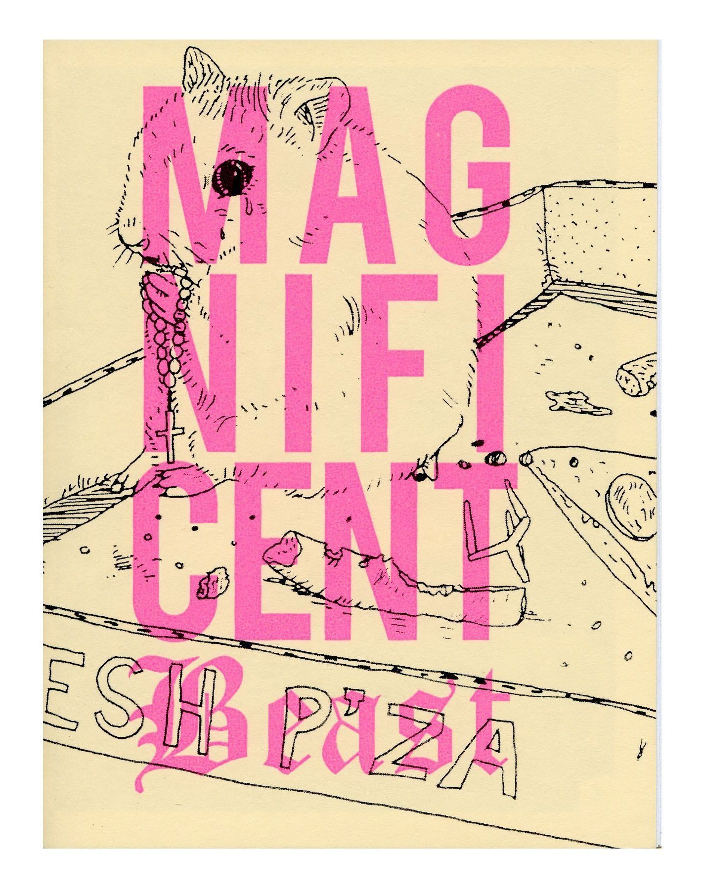 Small tan paper booklet featuring a line illustration of a small rodent holding a rosary, sitting inside a pizza box with leftovers, on the cover with the title overlaid in neon pink.Collection