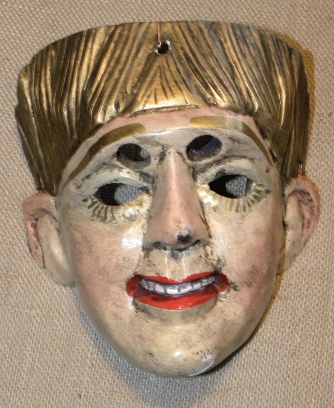 A life-sized triangular wood mask depicting a woman with ivory skin and subtle pink blush accents on the forehead, nose, and cheeks. The hair is gold and decorated with incised lines. Painted gold eyebrows are above two cutout eyeholes for the wearer and another set of cutout eyeholes lined with gold lashes. A large straight nose is above a smiling red mouth with white teeth. A wire is attached to the back of the mask. Overall signs of pigment loss.Context