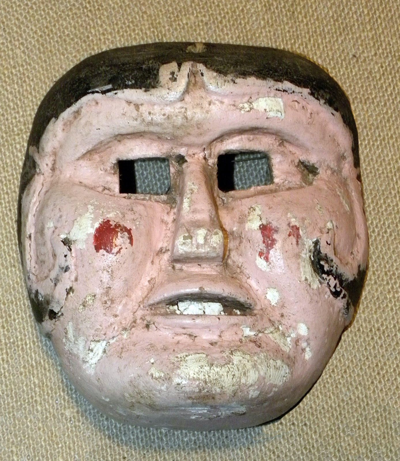 A life-sized circular wood mask depicting a woman with a pink complexion with red circles on the cheeks. The hair is dark brown and curls around the cheeks. Square cutout eyeholes are set in a carved-out area of the forehead. A flat nose is above a partly open mouth with white teeth. A wire is attached to the back of the mask. Overall signs of pigment loss and cracking.Context