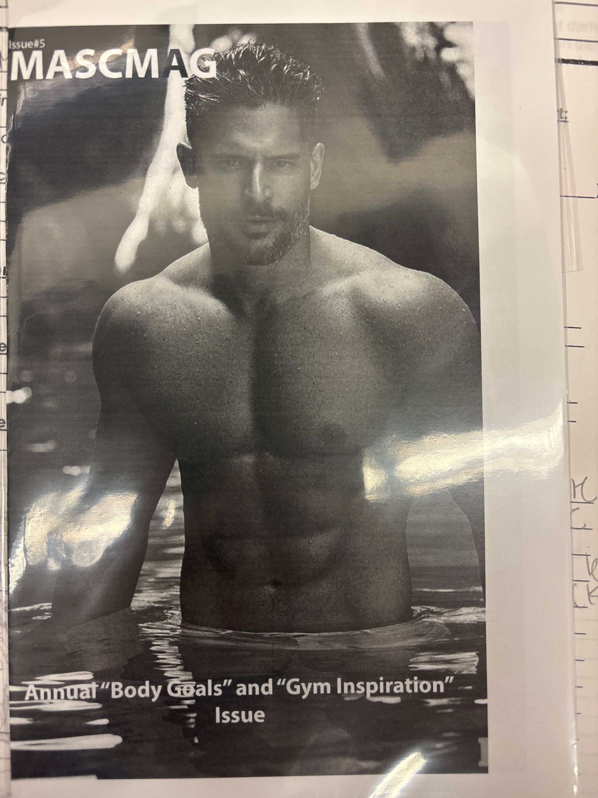 It is a small black and white magazine with a shirtless man coming out of water on the front cover.
