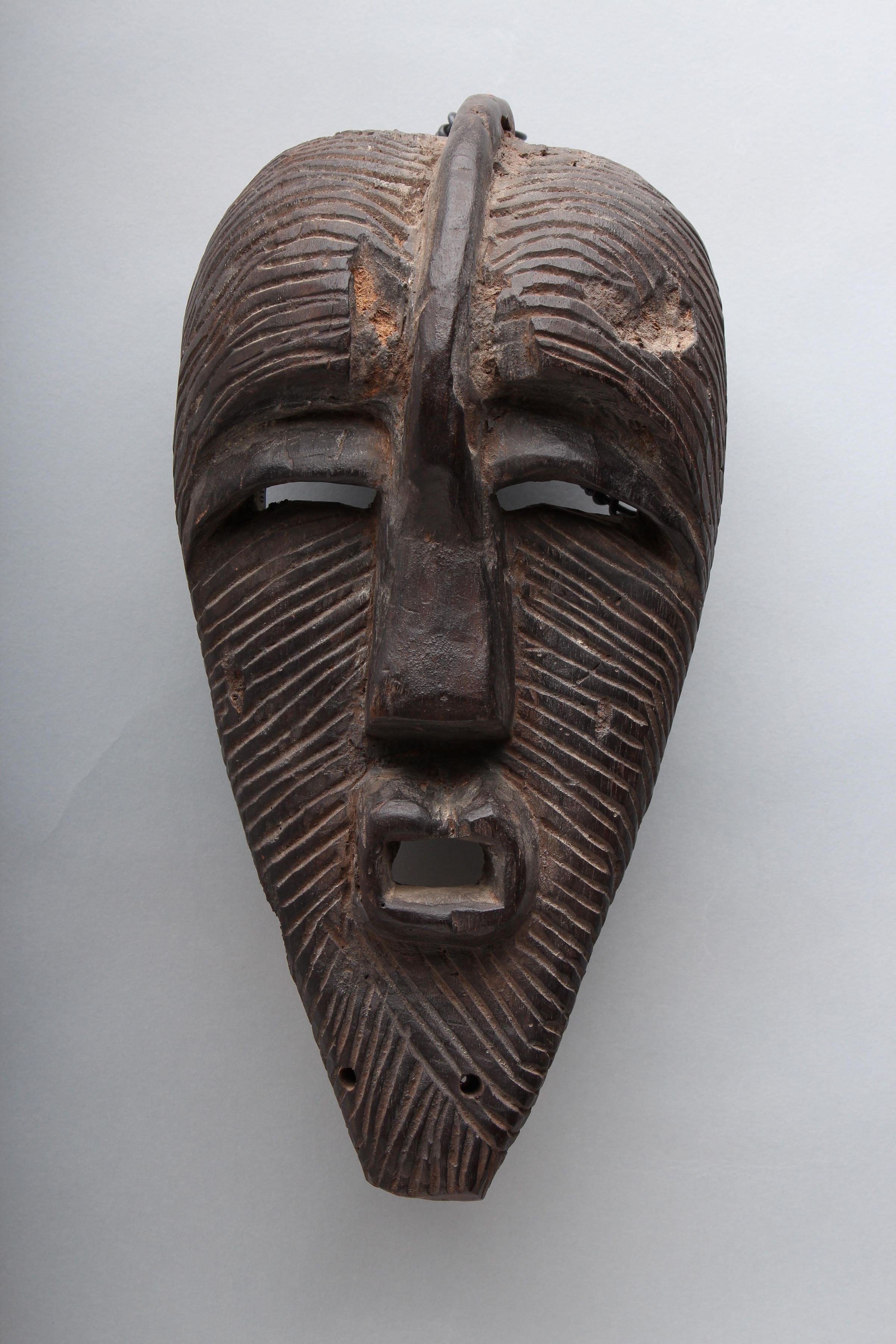 Medium wood mask with carved striations and geometric features, including triangular nose and protruding rectangular mouth.Context