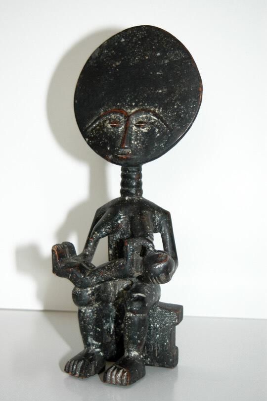 Carved wood, seated female figure, with highly stylized head, nursing a babyCollection