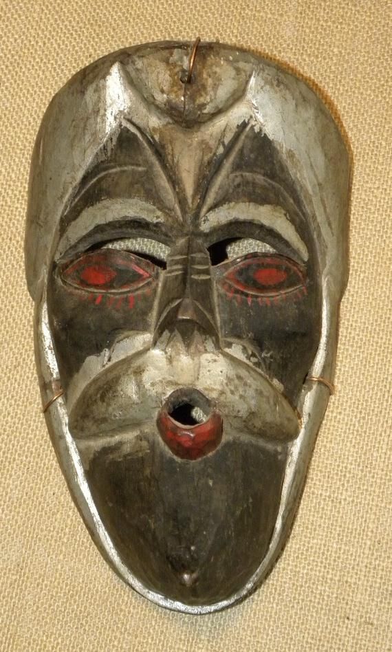 A life-sized oval wood mask depicting a man with a charcoal complexion. Silver hair surrounds the face. Carved and painted red eyes are underneath two cutout eyeholes for the wearer and incised brows. A small, snub nose is above a large silver mustache and a pursed red mouth. The chin is extended and pointy. A wire is attached to the back of the mask. Overall good condition with some cracking and pigment loss.Context