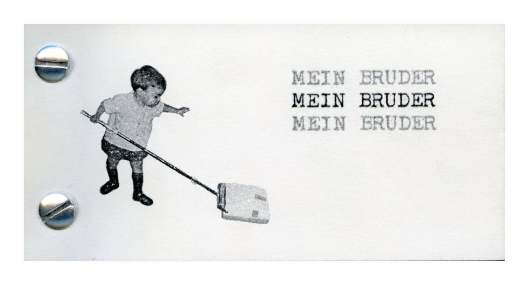 Small black and white cardstock booklet with a 2 metal screws binding the book from the left side. Black an white photo print of a young boy with a sweeper-broom is seen in the left of the booklet and on the right side, the phrase "Mein Bruder" is printed thrice with 2 gray prints above and under a black ink printed version.Collection