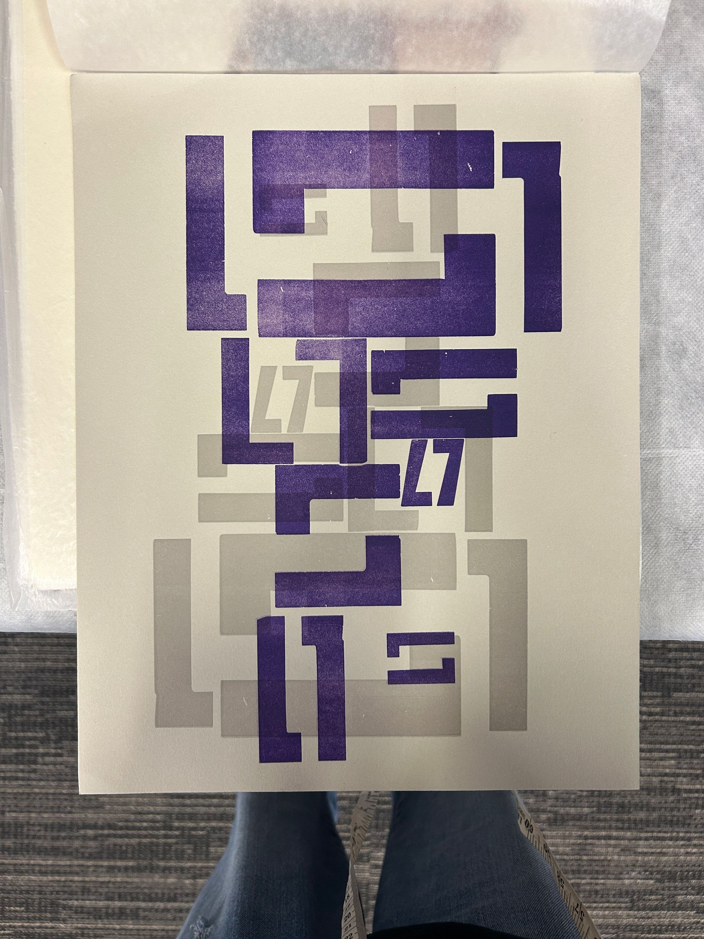 A large white, gray, and purple print of geometric shapes.Collection