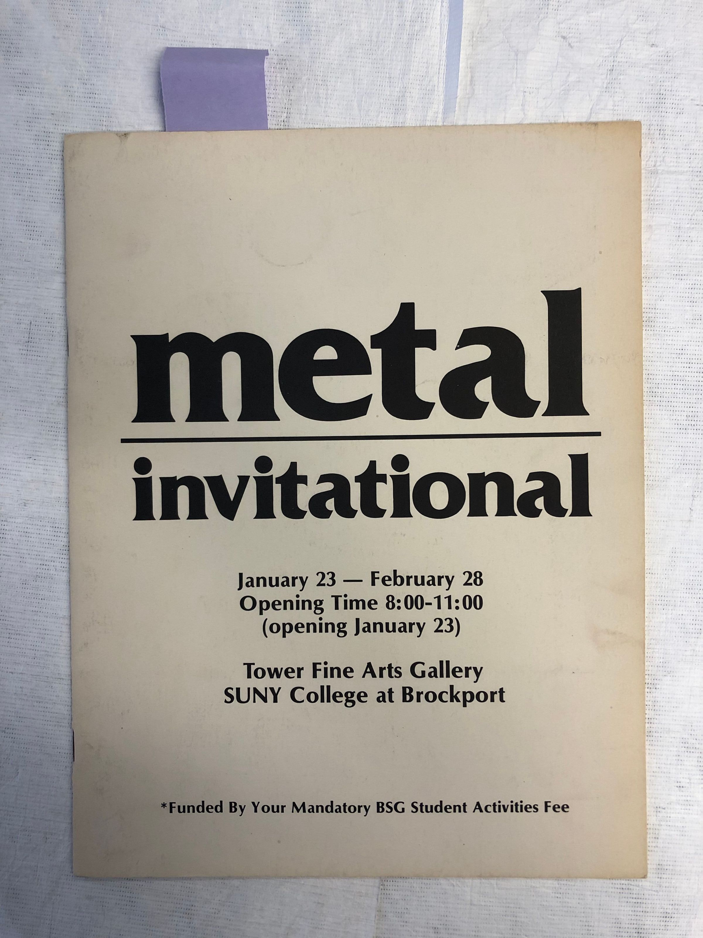 A medium sized, thin white book with the title vertically stacked in black print across the front cover. The interior contains an exhibition catalogue with biographical information on the artists, the images in black and white, one noted by stickynote.Collection