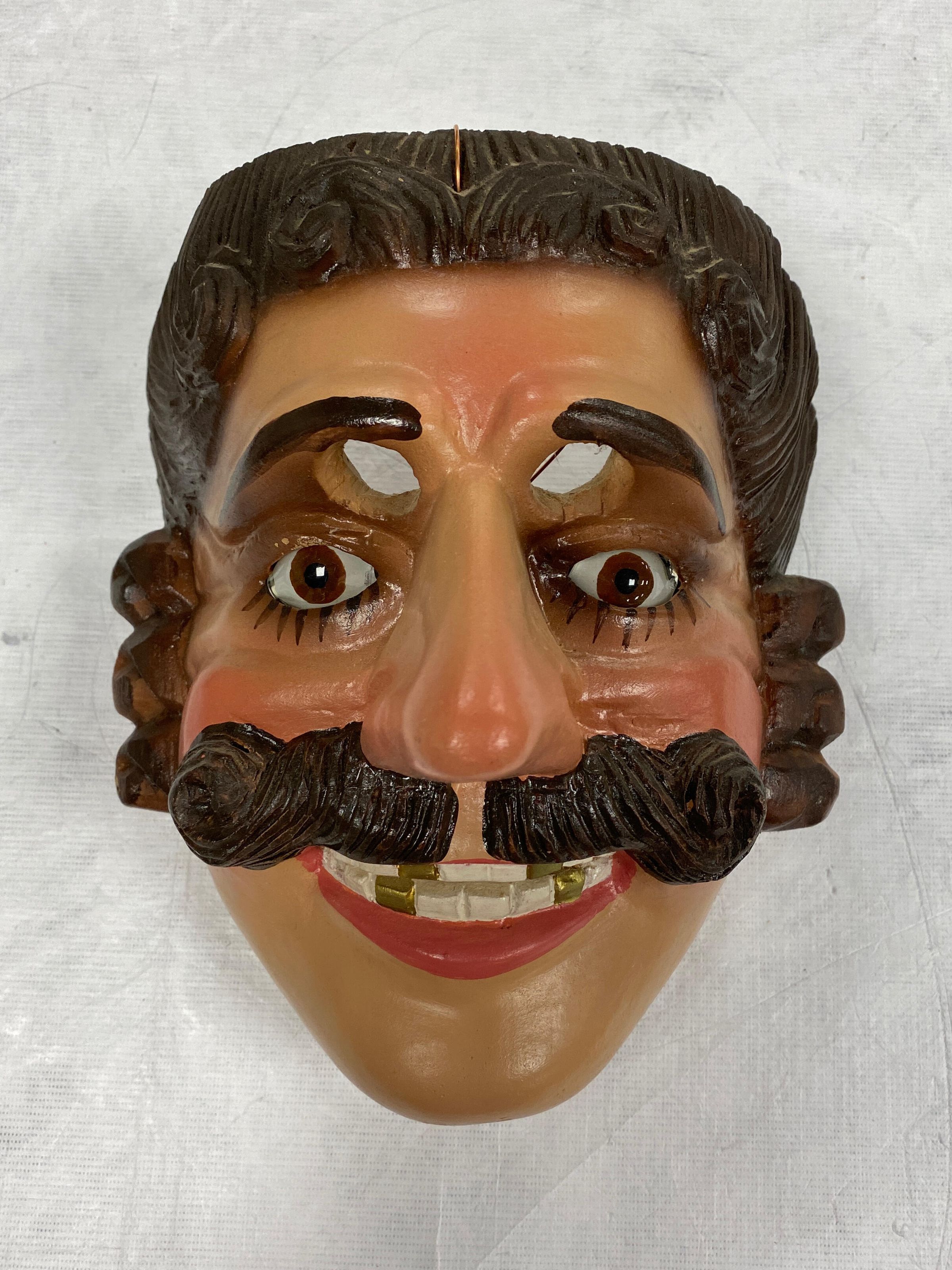 A life-sized round wood mask depicting a smiling man with a beige complexion and peach blush accents on the forehead, nose, and cheeks. There is stylized brown hair, sideburns, and a parted mustache. Inset brown glass eyes with painted brown lashes underneath and brown shading around. Cutout eyeholes for the wearer are under raised eyebrows. A comically large nose protrudes from the face. The smiling mouth has rouge-pink lips and white and gold teeth. Incised lines create wrinkles and a smiling expression. A copper wire is attached to the back of the mask. The mask is in excellent condition.Context