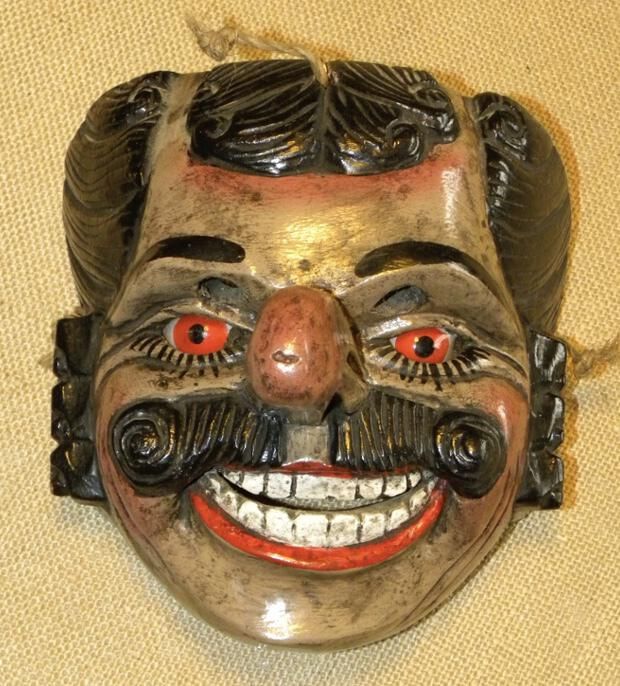 A life-sized round wood mask depicting a smiling man with a coffee-brown complexion and blush accents on the forehead, nose, ears, and cheeks. There is stylized black hair, sideburns, and a parted mustache. Inset red glass eyes with painted black lashes underneath and crow’s feet wrinkles. Cutout eyeholes for the wearer are under black eyebrows. A comically large nose protrudes from the face. The smiling mouth has cherry-red lips and large, white teeth. A wire and fraying rope are attached to the back of the mask. Overall signs of scratches and paint chipping.Context