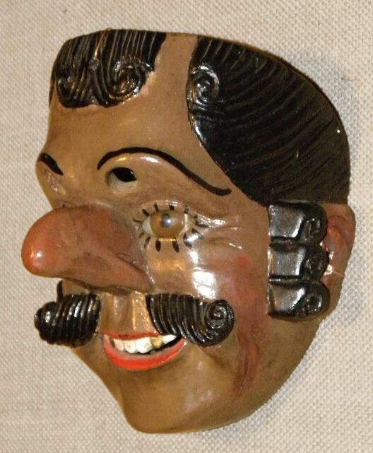 A life-sized oval wood mask depicting a man with a coffee-tbrown complexion. There is stylized black hair, sideburns, and parted mustache. Painted eyebrows over two cutout eyeholes for the wearer and inset brown eyes outlined with black lashes. A large nose is above an open mouth with white and gold teeth. A wire is attached to the back of the mask.Context