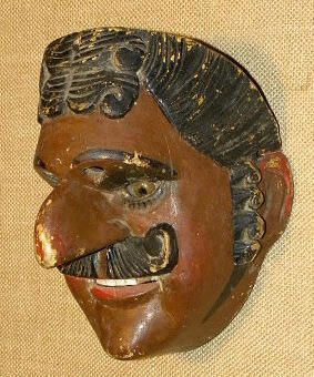 A life-sized oval wood mask depicting a man with a penny brown complexion and subtle blush accents. There is stylized black hair, sideburns, and parted mustache. Painted eyebrows over two cutout eyeholes for the wearer and inset brown eyes with black lashes. A large, hooked nose is above an open mouth with white and gold teeth. A wire is attached to the back of the mask. Overall signs of pigment loss.Context