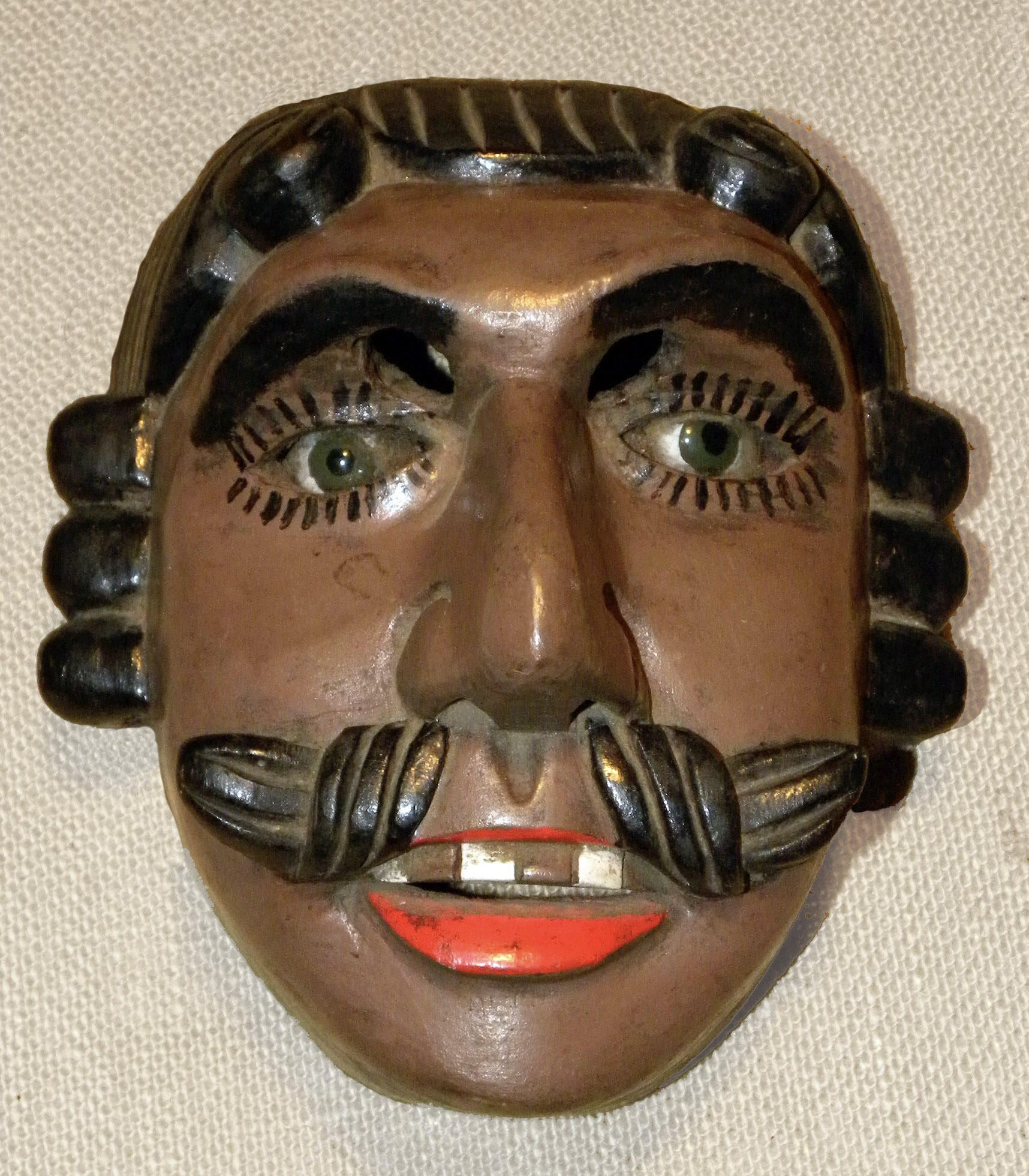 A life-sized rectangular wood mask depicting a man with a walnut brown complexion. There is stylized black hair, sideburns, and a parted mustache. Painted eyebrows over two cutout eyeholes for the wearer and inset brown eyes outlined with black lashes. A large, curved nose is above a slightly open red mouth with white and brown teeth. A wire is attached to the back of the mask.Context