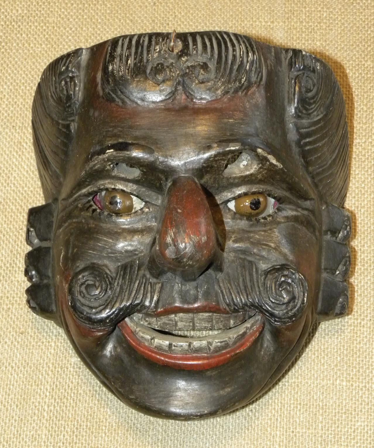 A life-sized triangular wood mask depicting a man with umber-brown skin and red-purple blush accents on cheeks and nose. There is stylized black hair, sideburns, and a parted mustache. Painted eyebrows over two cutout eyeholes for the wearer and inset brown eyes outlined with black brows. A large, curved, extended nose is above a smiling red mouth with white teeth. A wire is attached to the back. Overall signs of pigment loss and scratching.Context